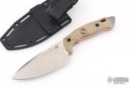 The Alaris is a hefty fixed blade designed by FOBOS Knives that can pack a lot of power behind every use. The knife comes with a nearly 5" blade made from a 0.2" thick piece of CPM-3V to make even the heaviest task give way. A wide drop point design lends to the power of this knife. This hefty piece of steel continues down past the handle to form a large bashing point that can perform glass-breaking or even hammering duties. The handles are ergonomically designed with several comfortable grooves that help lock your hand on while you swing this beast around. A bow-drill divot in the center of the handles assists in a survival situation proving that this knife truly speaks to operators or anyone looking for a hard-use knife.