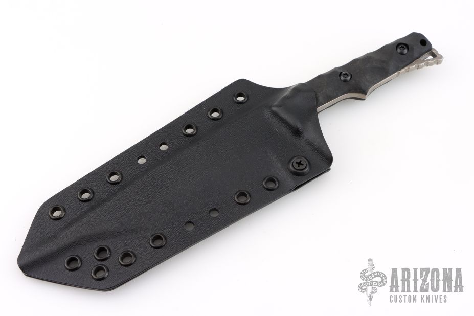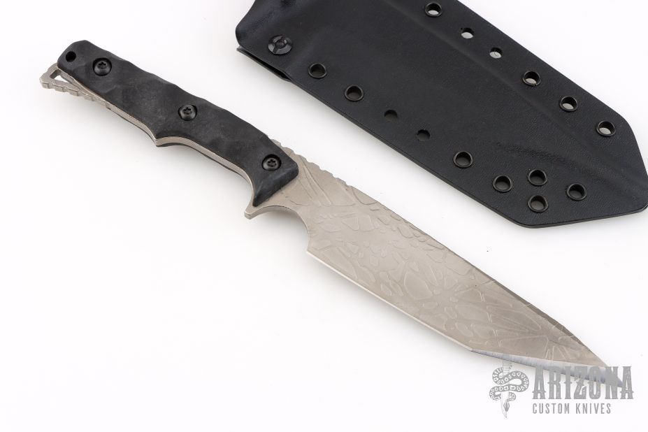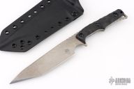 This Spectre by Bawidamann Blades features an acid etched Quicksilver blade with false top edge, notched thumbrest, full tang construction, .190" blade stock and 1.369" blade depth. The handle has IM Bawidamann Chunked Pattern Carbon Fiber scales (proprietary Carbon fiber composite). Comes with a kydex sheath. Excellent condition.