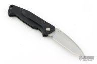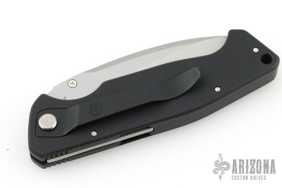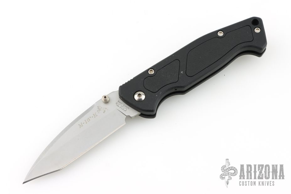 This M-16-K Police/ Military D/A has a bead blasted 440C stainless steel tanto blade with dual thumb studs and notched thumb rest. Handle is coated black aluminum with non-slip inserts, tip down stainless steel clip and lanyard hole. The button is hidden beneath the rubber insert closest to the blade. Comes with the wrong Colt box. Has some scuffs and scratches, great overall condition.