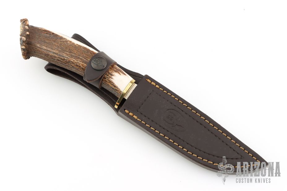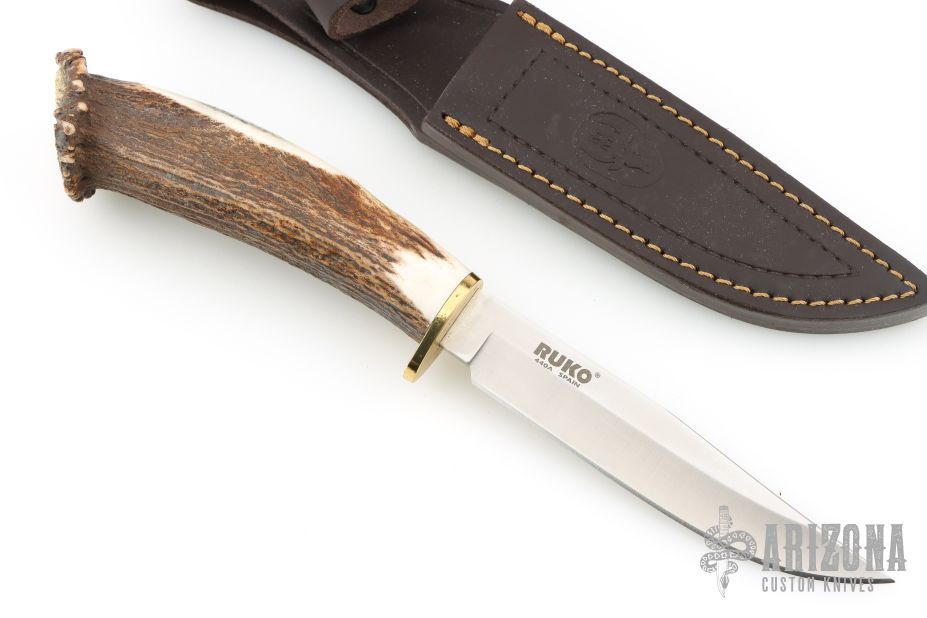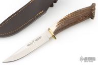 This Ruko by Muela features a satin finished blade with hidden tang construction, .141" blade stock and .849" blade depth. The handle has a brass guard and crown stag grip. Comes with leather sheath and original box. Has a couple light scratches, otherwise Excellent condition.