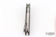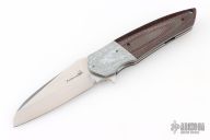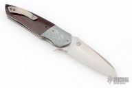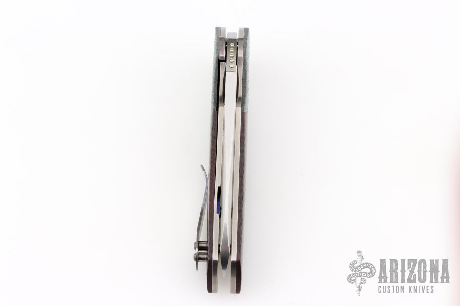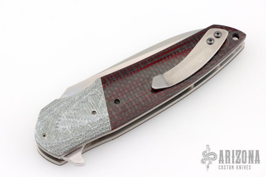 This Bolide Flipper from Mike Zscherny (Scorpion Knives) and Faisal Yamin features a hand rub satin finished blade with swedge, nickel silver dots on the thumbrest, flipper. The handle has silver twill bolsters, red/black carbon fiber scales, satin titanium liners, titanium tip up pocket clip. Comes with a zippered case. Excellent condition.