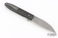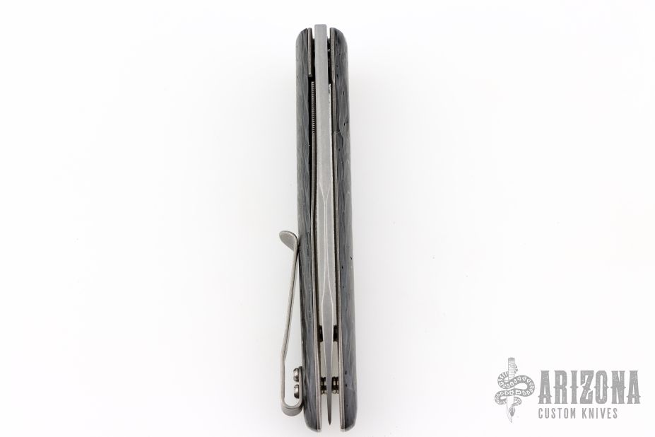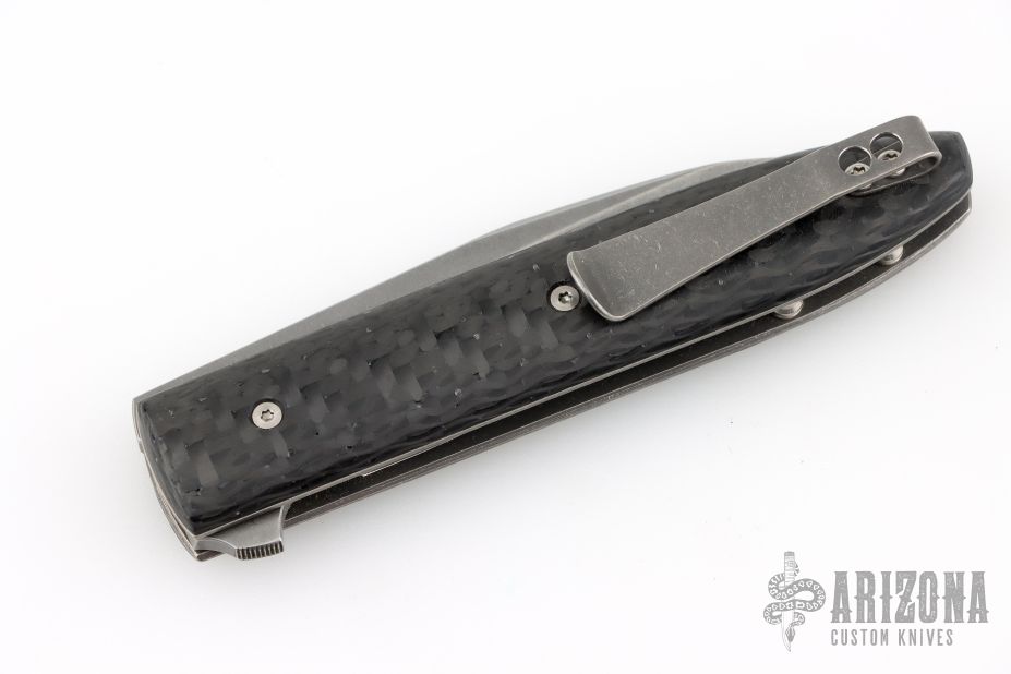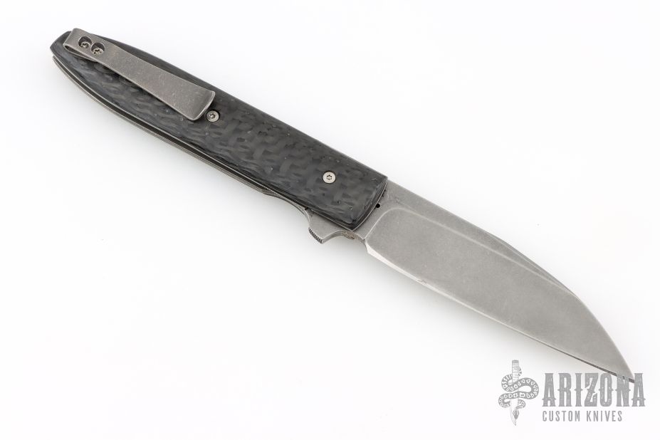 This XL Wharncliffe flipper by Brad Zinker features a stonewashed wharncliffe blade with notched flipper, .145" blade stock. The handle has carbon fiber scales, tumbled titanium liners and tip up titanium clip. Nice detent, blade seating and lock up. Excellent work. Flips like a dream. Includes a zippered case. Excellent condition.