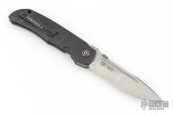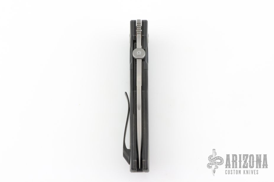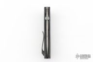 This Eagle Rock linerlock is from Custom Knife Factory and designed by Bob Terzuola. It features a bead blast finish multi-ground blade with fullers and false top edge, notched thumbrest and a thumbdisc. The handle has Timascus pivot collars, black bolsters, carbon fiber scales, black titanium liners, black backspacer, tip up black titanium clip. Nice blade seating, detent, and lockup. Comes with a maker's case, extra hardware and COA dated 3/23 and #150. Excellent condition.