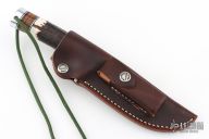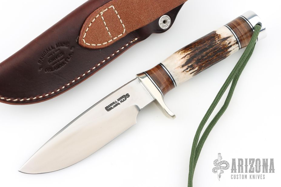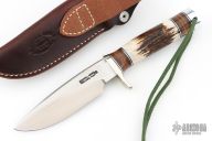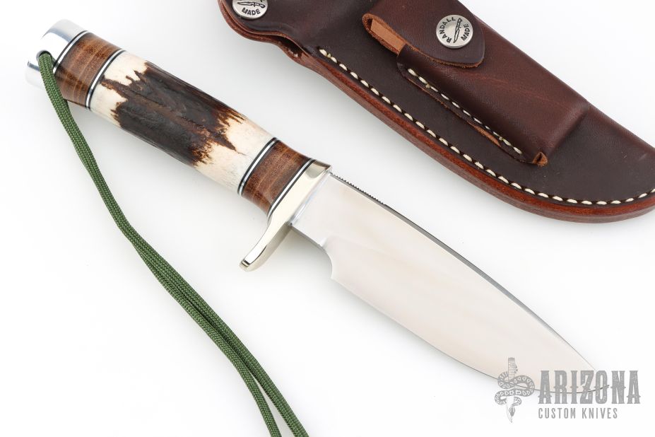 The Model 25-5 by Randall Made Knives is a drop point hunter similar to Model 11, but handle construction is reminiscent of 1930′s design. Excellent skinning, outdoors knife. This knife has a stainless steel blade with notched thumbrest, .245" blade stock and 1.345" blade depth, hidden tang construction. The handle nickel guard and duralumin pommel with lanyard hole, stag grip with stacked leather, black and duralumin spacers. Comes with brown leather sheath and original paper wrapping. New from maker.
