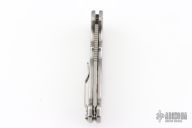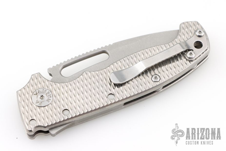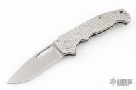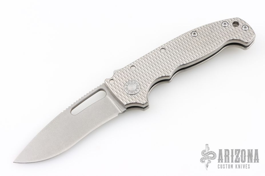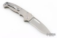 This AD20S by Andrew Demko features a stonewash finish blade with notched thumbrest, thumbhole and dual thumbstuds. The handle has an all Titanium frame with a tip up stainless steel clip and "Shark" lock release on the spine. Comes with original box. New Condition.