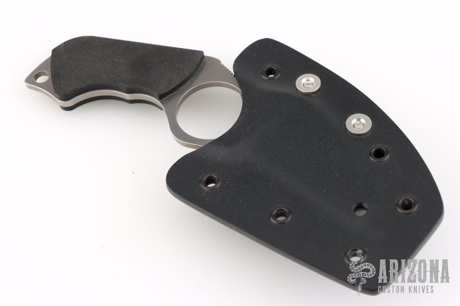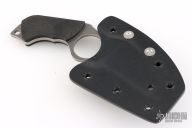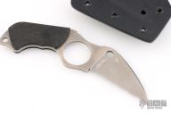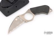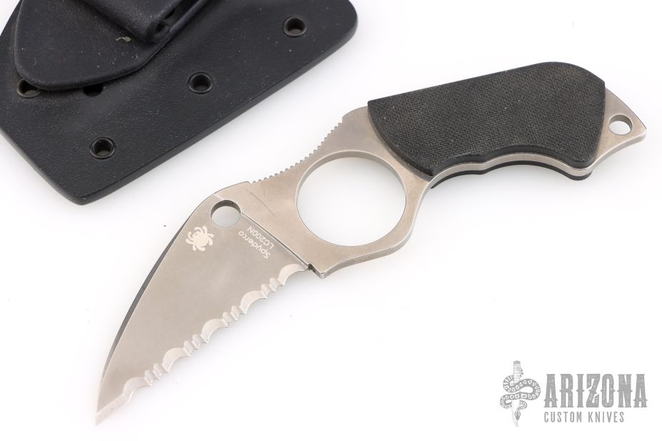 This Swick 5 by Spyderco features a tumble finished blade with serrations and notched thumbrest, .118" blade stock, 1.177" blade depth, and full tang construction. Finger hole is .905" in diameter, black g10 handle. Comes with original box, kydex sheath and papers. Also includes ball chain. Excellent condition.