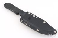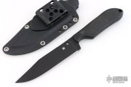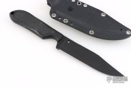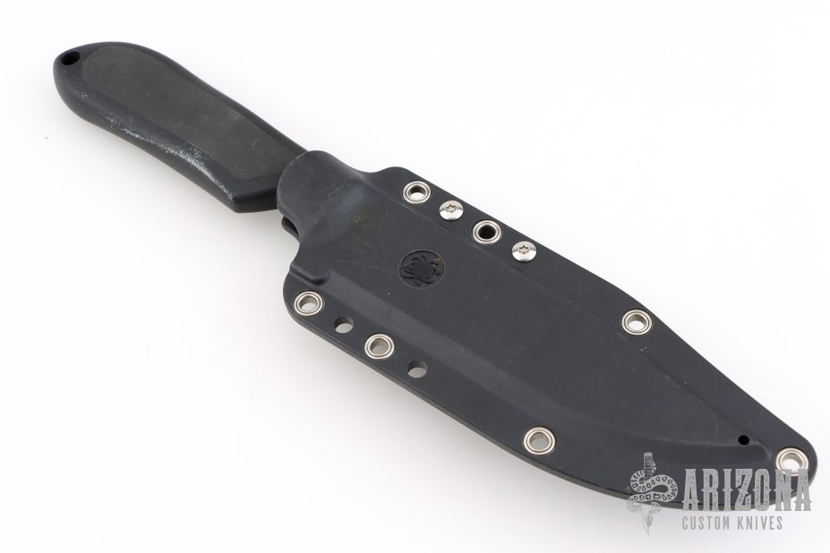 This Perrin inspired bowie by Spyderco has a black VG-10 clip point blade with hidden tang and notched thumb rest. Blade stock is .156", depth is 1.147". Handle is black plastic and rubber. Excellent condition. Comes with original box, papers, and Spyderco Kydex sheath. Has a couple light sheath scuffs, excellent condition otherwise.