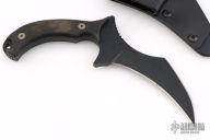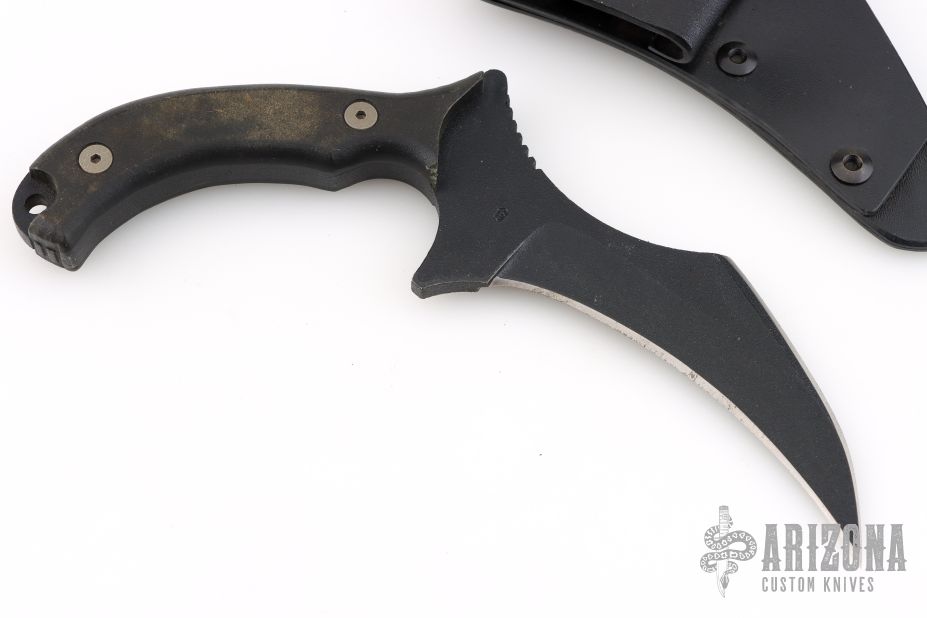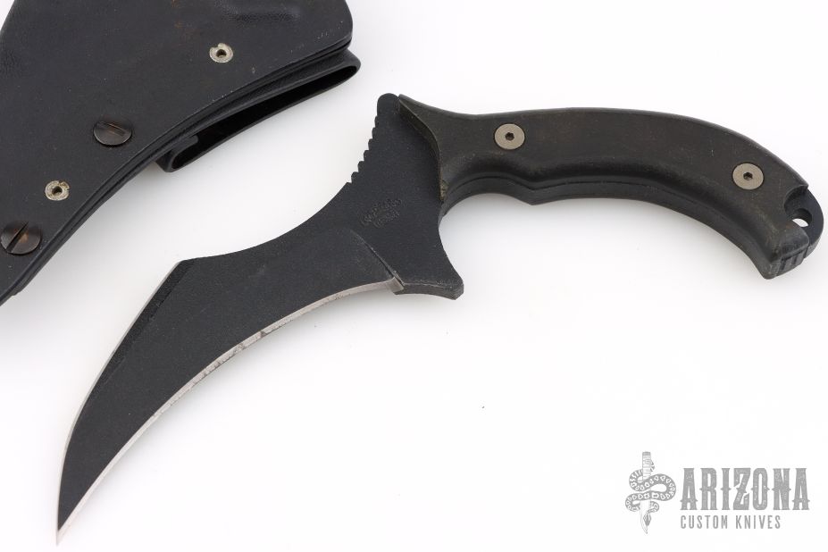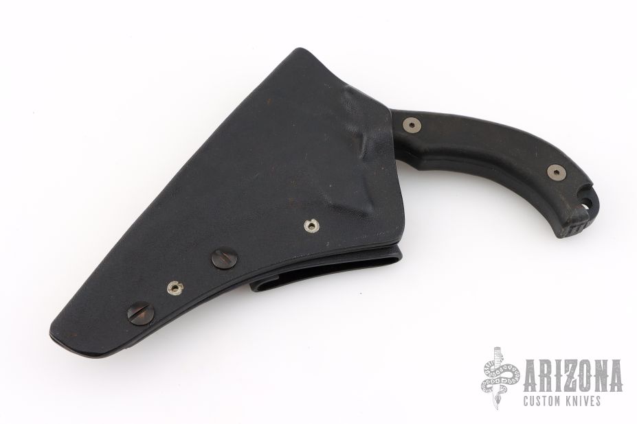 This Kamaitachi Custom Mini-UUK is a Laci Szabo Design made by Robert Newton, it features a black hawkbill blade with sharpened top edge and notched thumbrest, .230" thickness and 1.257" blade depth, full tang construction with coated nonferrous metallic scales with lanyard hole. Knife comes with a kydex sheath with Kydex belt loop. Has scuffs and scratches, great overall condition otherwise. "8" marked on the blade.