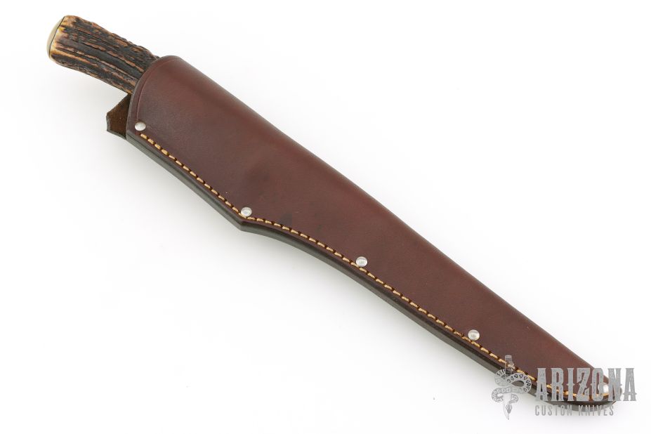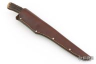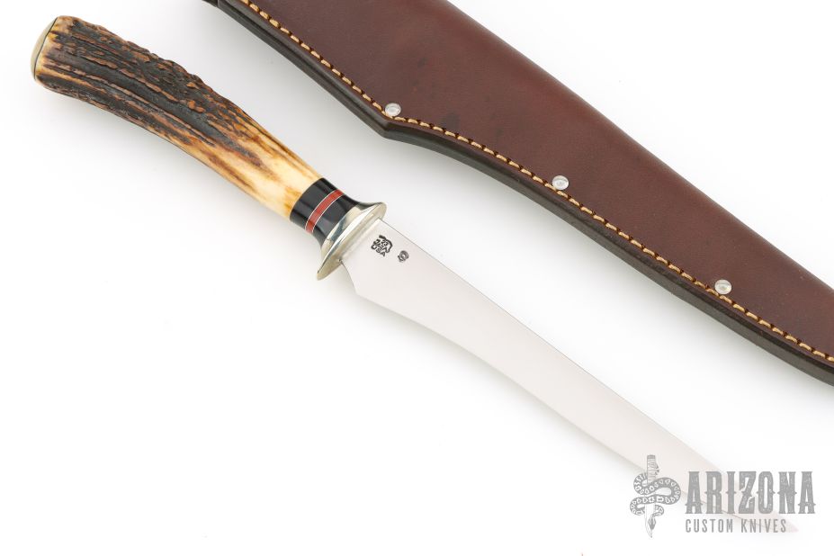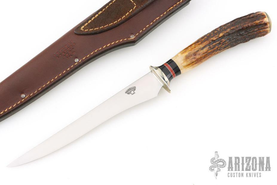 This Fillet Knife by James Behring features a satin finished convex ground blade, .094" blade stock and 1.038" blade depth, hidden tang construction. The handle has a nickel silver guard, sambar stag grip with black/aluminum/red spacer pattern, muskox butt. Comes with a brown leather sheath. Excellent condition.