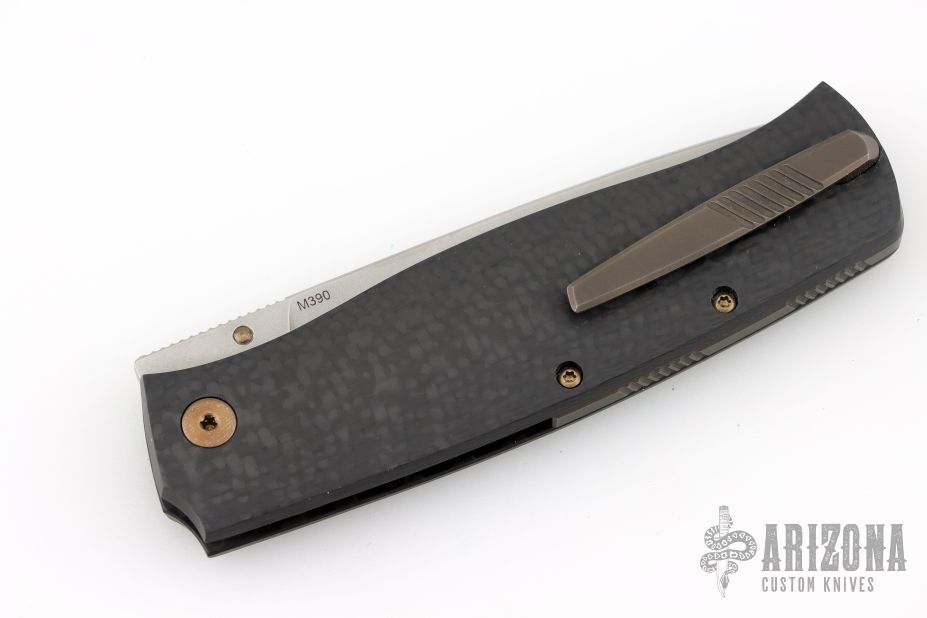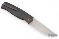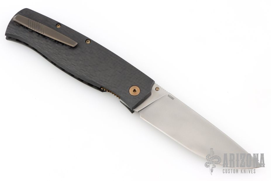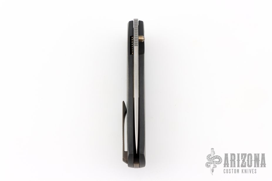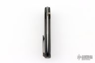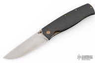This Strizh by Alexander Cheberkov features a bead blast finished blade with notched thumbrest and a single thumbstud. The handle has a carbon fiber frame with blasted hardware and inlaid liner, matching backspacer and tip up clip with hidden screws. Comes with original box and card. Dated 2019. Has a couple light scuffs, Excellent condition.