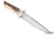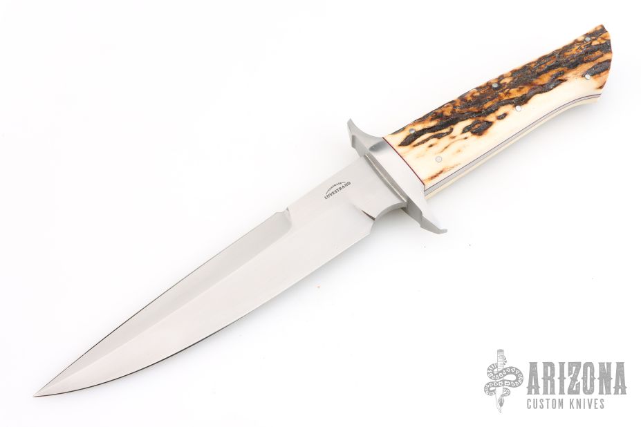 This Fighter by Schulyer Lovestrand features a hand rub satin finished blade with a sharpened top edge, .198" blade stock, 1.300" blade depth, full tapered tang construction. The handle has a stainless steel guard, nice stag scales with red liners. Excellent condition. Comes with a zippered case.