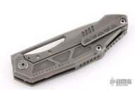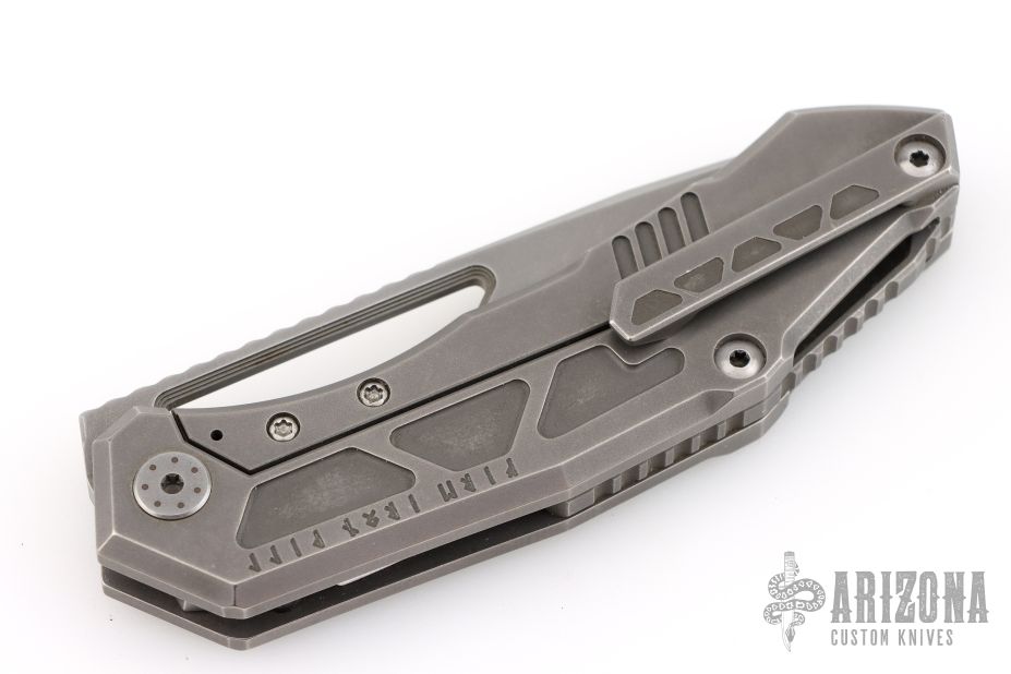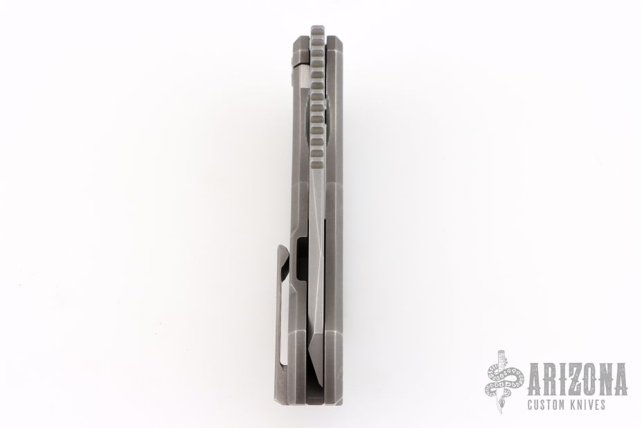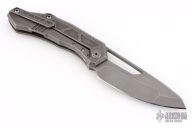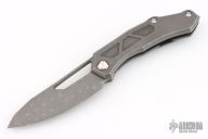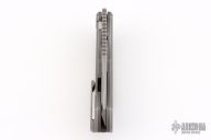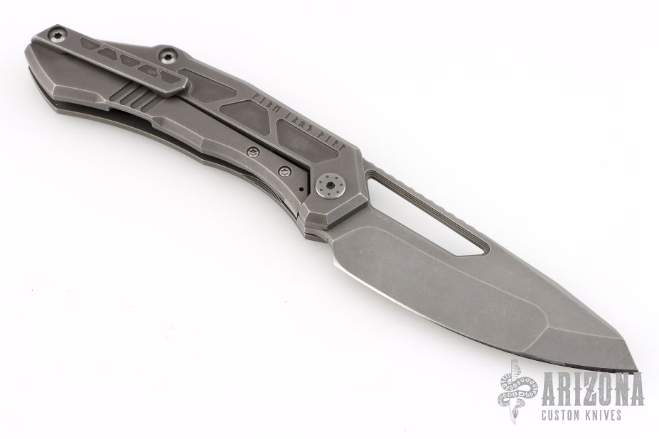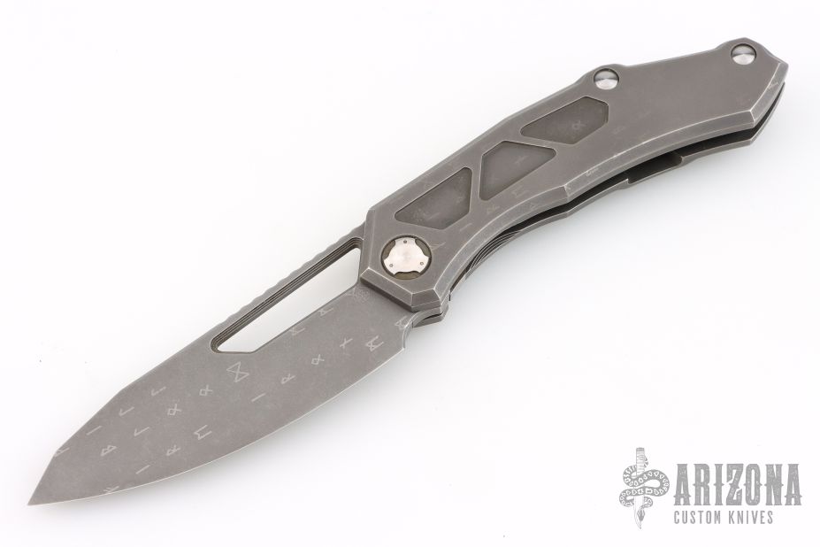 This MK1 Warg by DC Munroe features a stonewashed CPM-3V drop point blade with chisel ground, compound grind, step milled thumbhole and notched thumbrest. Copper pivot inlays, lockface insert and overtravel stop. The handle has a milled and stonewashed titanium frame with matching tip up clip and a backspacer with lanyard hole. Has ghost and deep laser engraved Norse runes. Consignor denotes it is a one-off. Has some scratches and scuffs on the pivot and clip. Great overall condition otherwise.