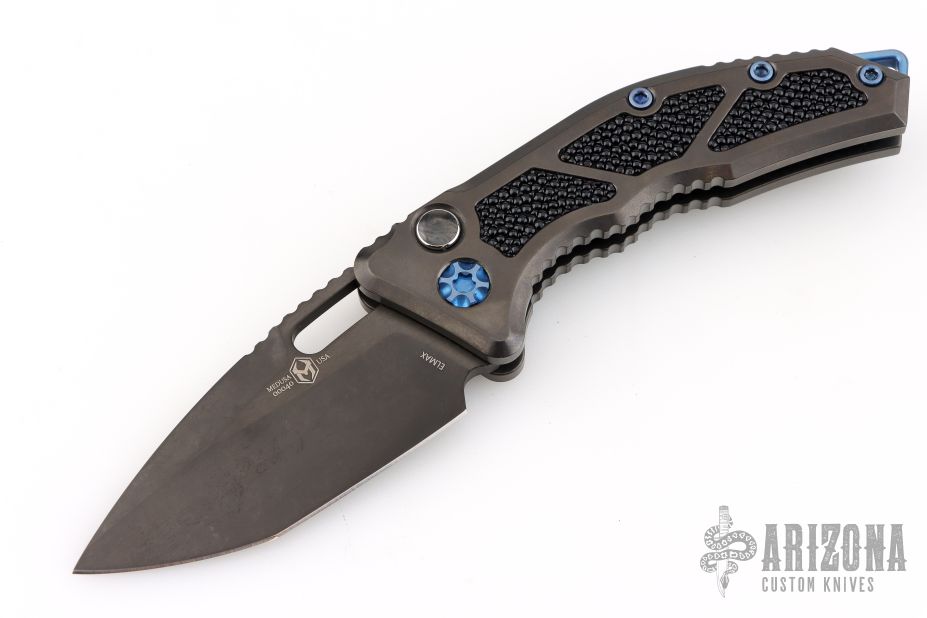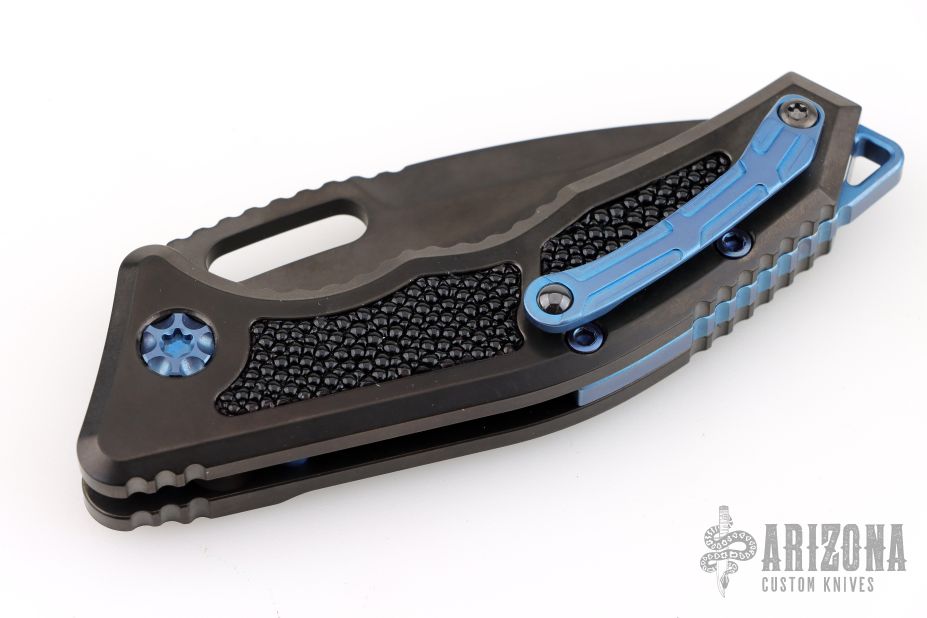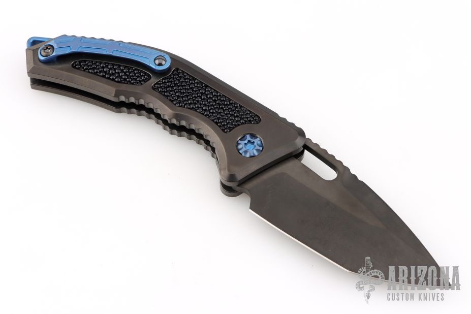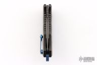 This Medusa by Heretic Knives features a blackwashed tanto blade with false top edge, notched thumbrest. The handle has a DLC stonewashed titanium frame with carbon fiber inlaid button, ray skin inlays, anodized backspacer and a matching tip up clip with ceramic ball. Comes with original box. #00040. Excellent condition.