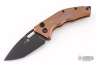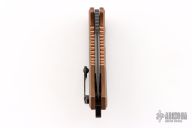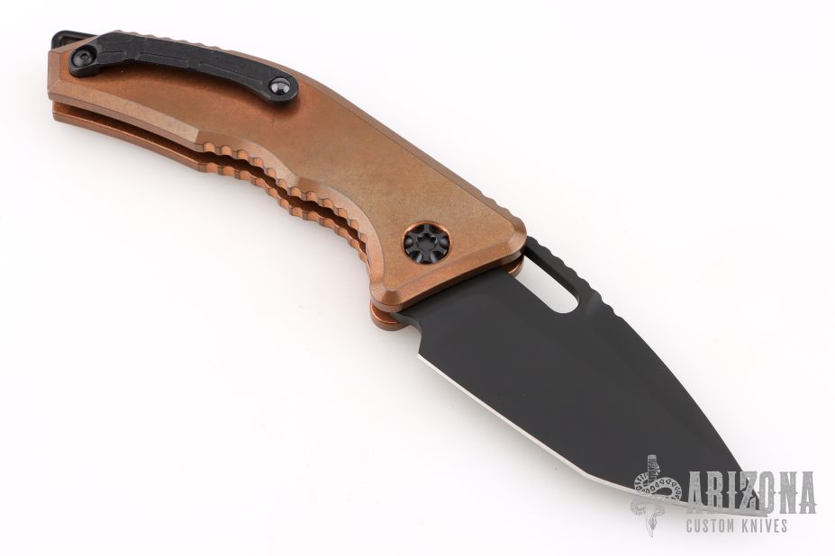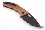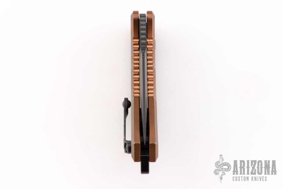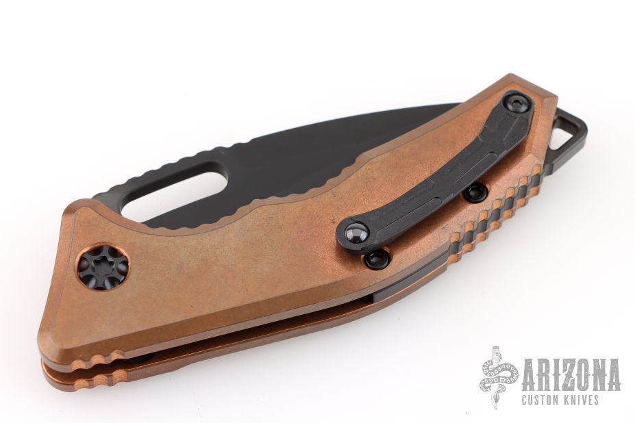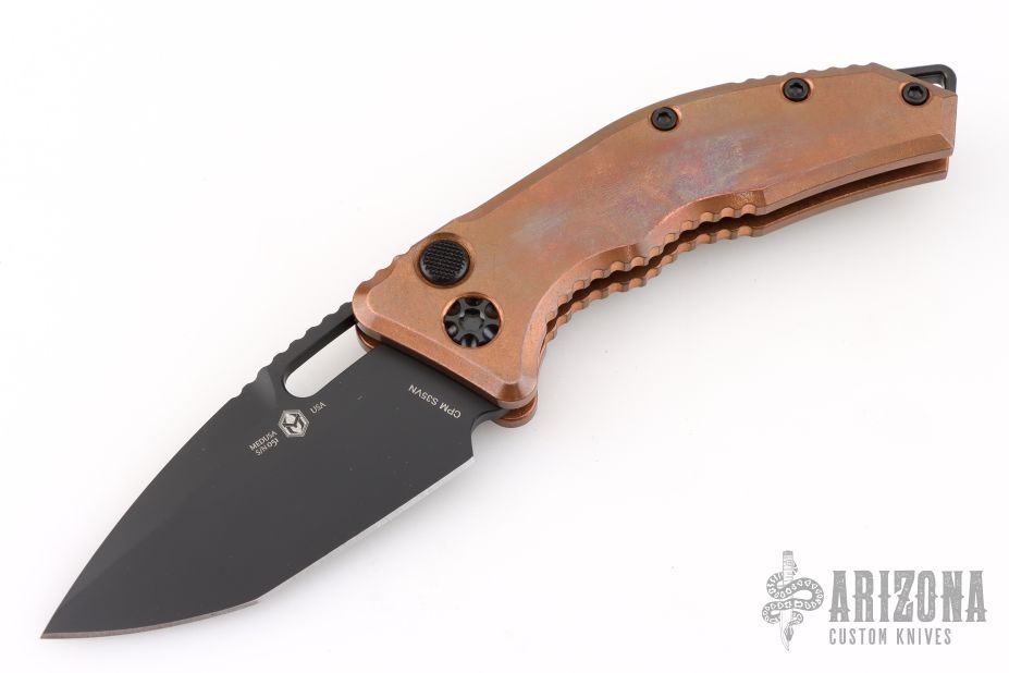This Heretic Knives Medusa Automatic features killer Copper handles that will form an excellent patina. The medusa is a push button automatic developed with ergonomics in mind. The blade is DLC coated S35VN in a tanto edge and the hardware is blacked out tactical. The roller ball pocket clip is also black finished.