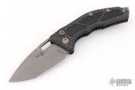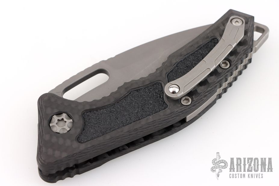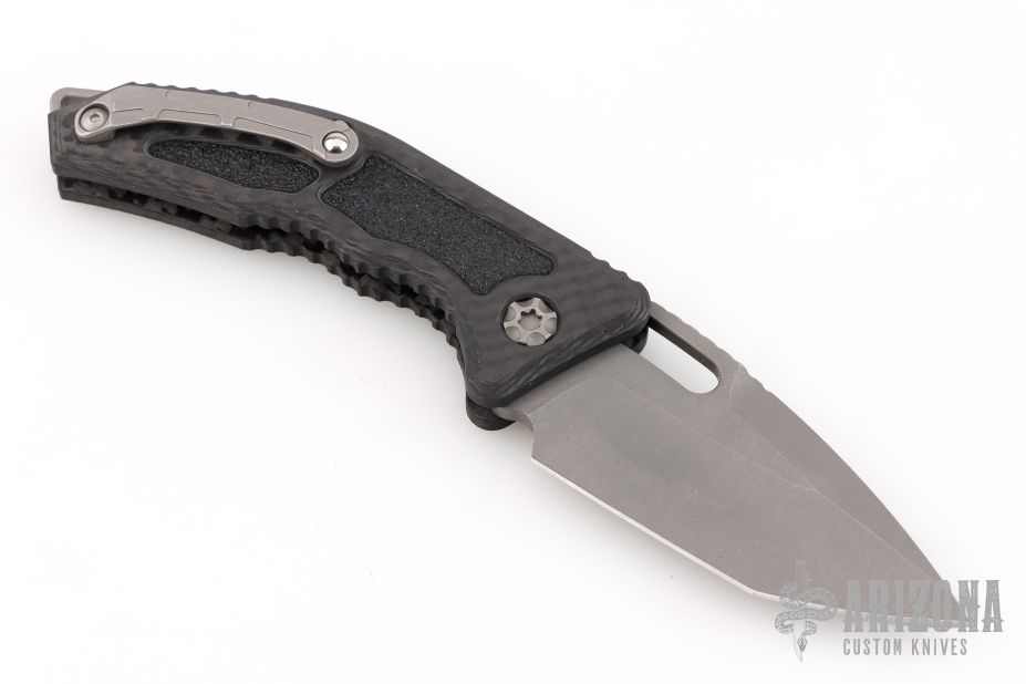 This Medusa by Heretic Knives features a battle worn tanto blade with false top edge, notched thumbrest. The handle has a carbon fiber frame with checkered push button, battleworn backspacer and a tip up stainless steel clip with ceramic ball. Comes with original box. #00148. Excellent condition.