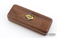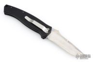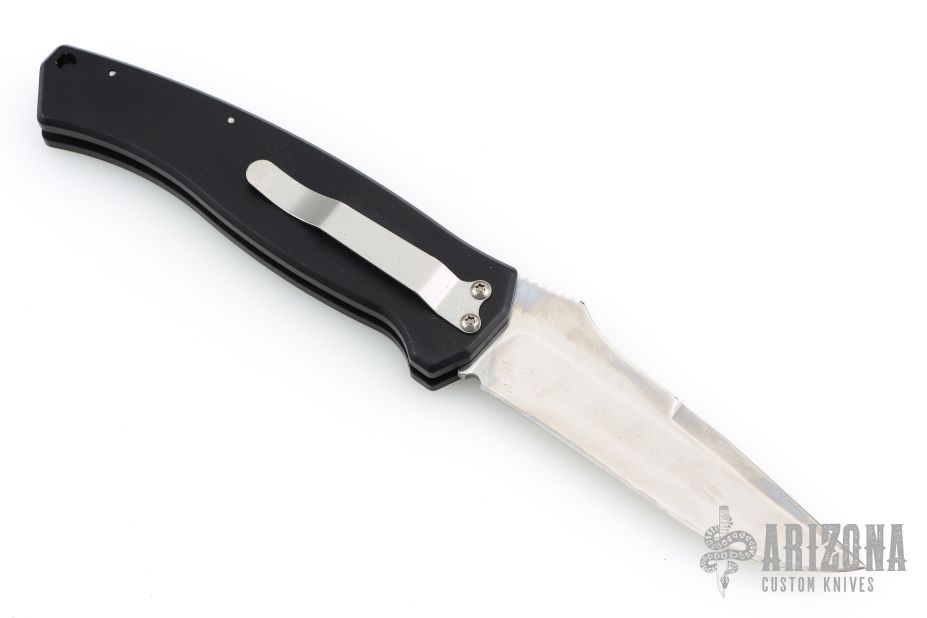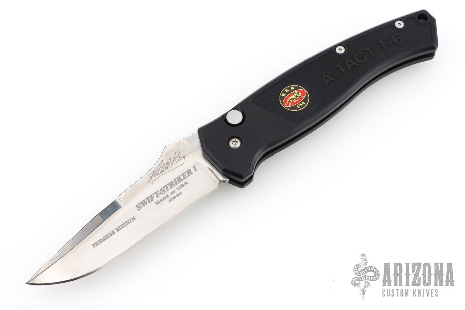 This is a Swift Striker I automatic by Randall King Knives features a mirror polished blade, notched thumbrest and false top edge. Stainless steel clip, tip down carry. Sliding safety on spine of the black aluminum handle. Comes in original wood clamshell style box with outer paper sleeve. The knife has a couple light scuffs, but is in excellent condition.