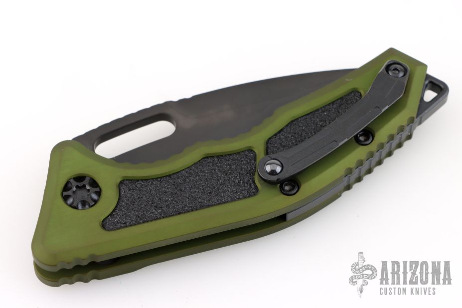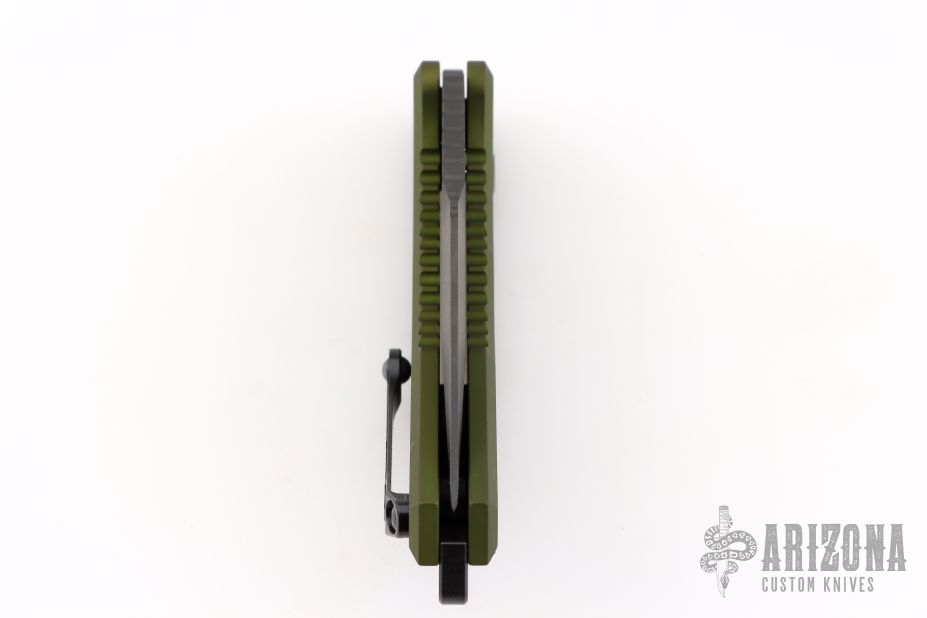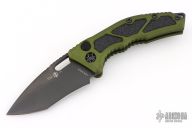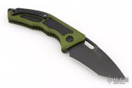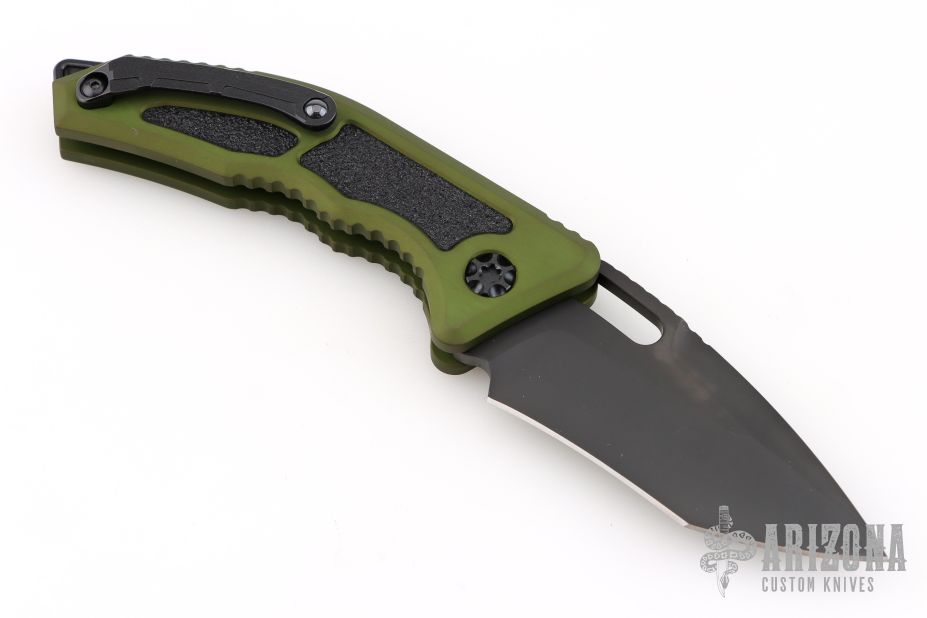 This Medusa by Heretic Knives features a DLC tanto recurve blade with false top edge, notched thumbrest. The handle has a green aluminum frame with checkered push button, black backspacer and a tip up stainless steel clip with ceramic ball. Comes with original box. Excellent condition. S/N 00088