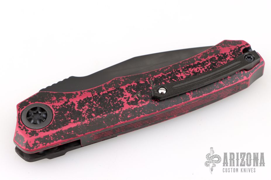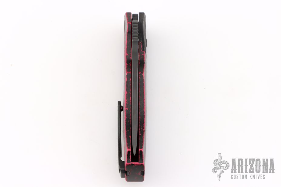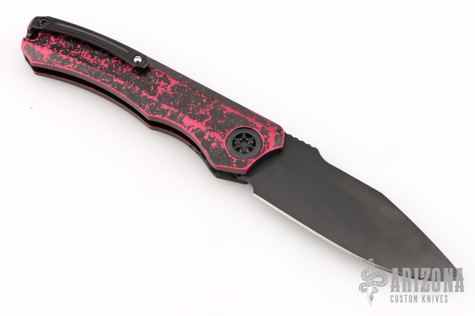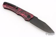 This Wraith Auto by Heretic Knives features a DLC clip point blade with false top edge and notched thumbrest. The handle has a carbon fiber bolster, integral breakthrough red aluminum handle with black tip up stainless steel clip and hardware. Comes with original box. S/N 00580. Excellent condition.