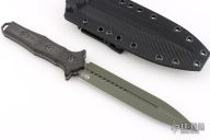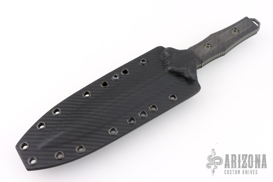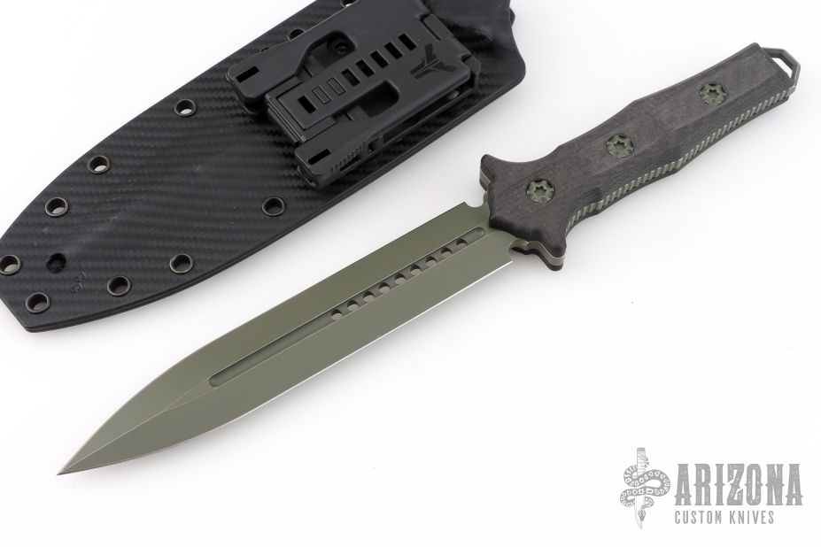 This Nephilim by Heretic Knives features a double-edged battleworn green blade with fullers, .205" blade stock and 1.174" blade depth, full tang construction. The handle has carbon fiber scales with battleworn green hardware, lanyard hole at the butt. Comes with original box and Kydex sheath. Excellent condition. S/N 00248