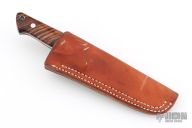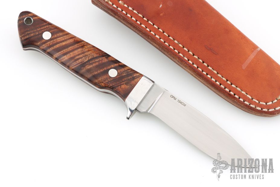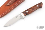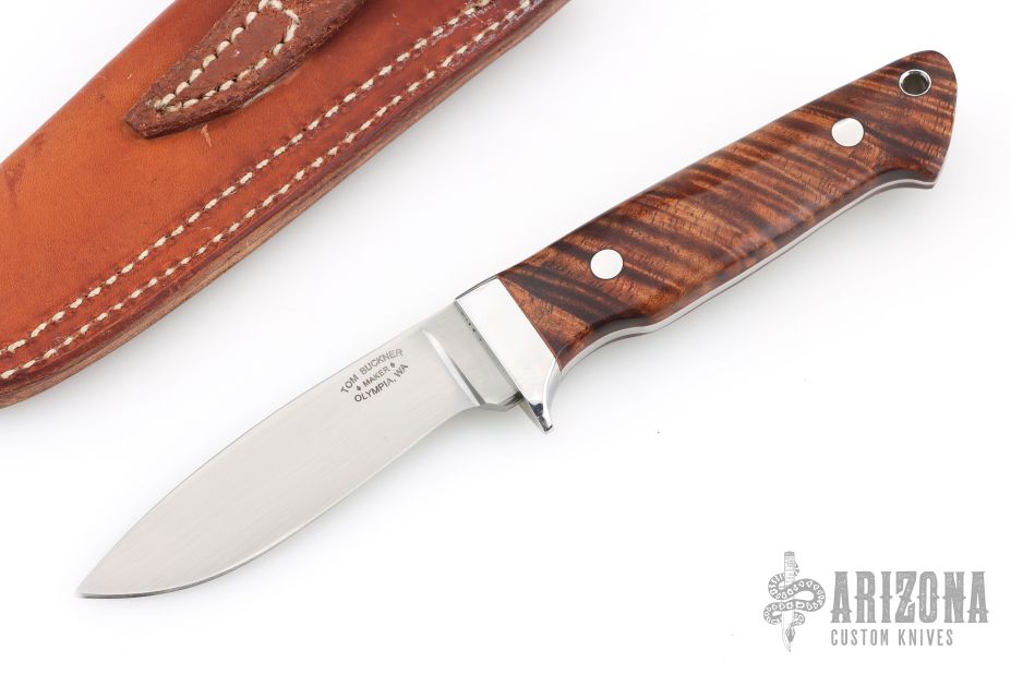 This knife by Tom Buckner features a hand rub satin finished drop point and recurve blade with a tapered tang construction.  .159" Blade Stock.  .91" Blade Depth.  The handle features a steel guard with pinned wood (koa?) scales.  Includes a brown leather sheath. Has some light scratches, otherwise Excellent Condition.