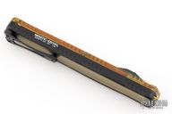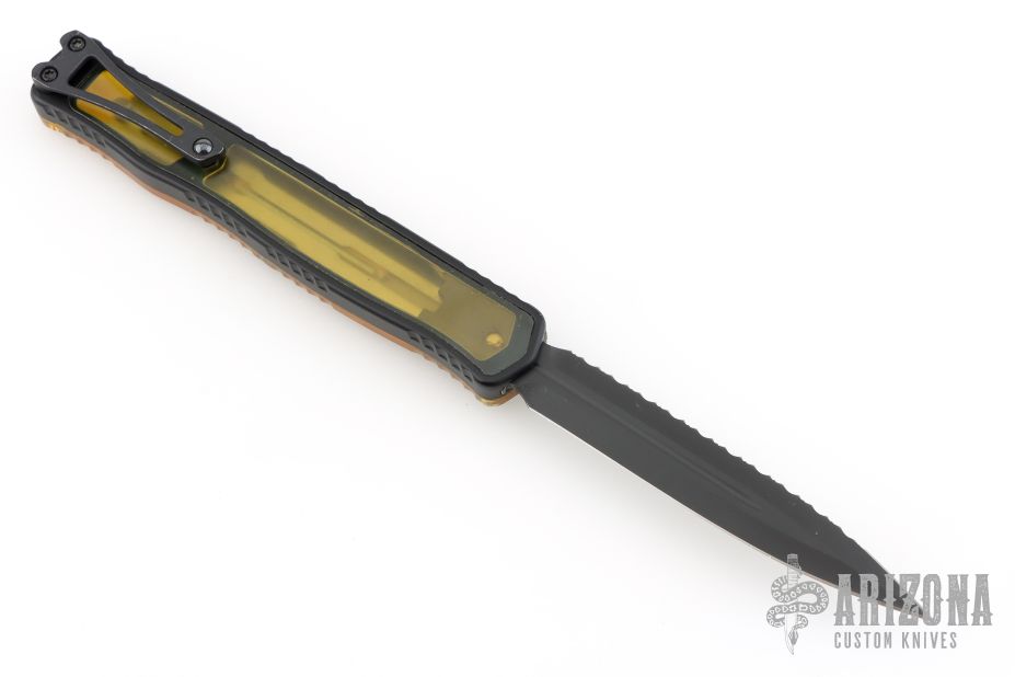 This Cleric II OTF by Heretic Knives features a black double edged Magnacut blade. The handle has a black aluminum frame with Ultem cover and inlay, with DLC titanium tip down clip. Comes with original box and lube. Excellent condition. #230