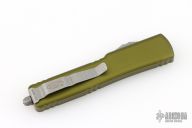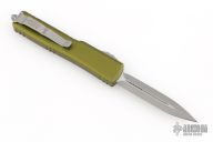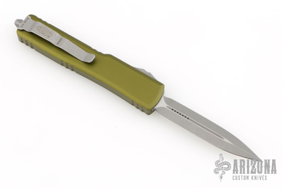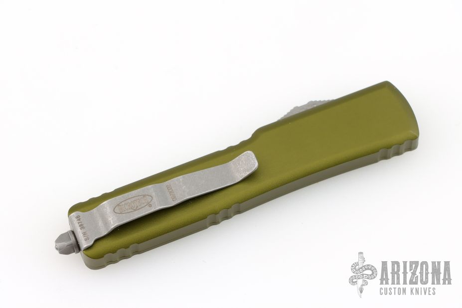 This UTX-70 OTF automatic by Microtech features an apocalyptic finished blade with a standard edges. The handle has a green aluminum frame with blasted stainless steel tip down clip. Serial number 38746 and dated 09/2022. Comes with original box and papers. Excellent condition.