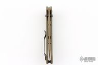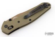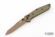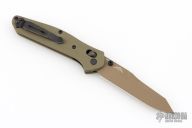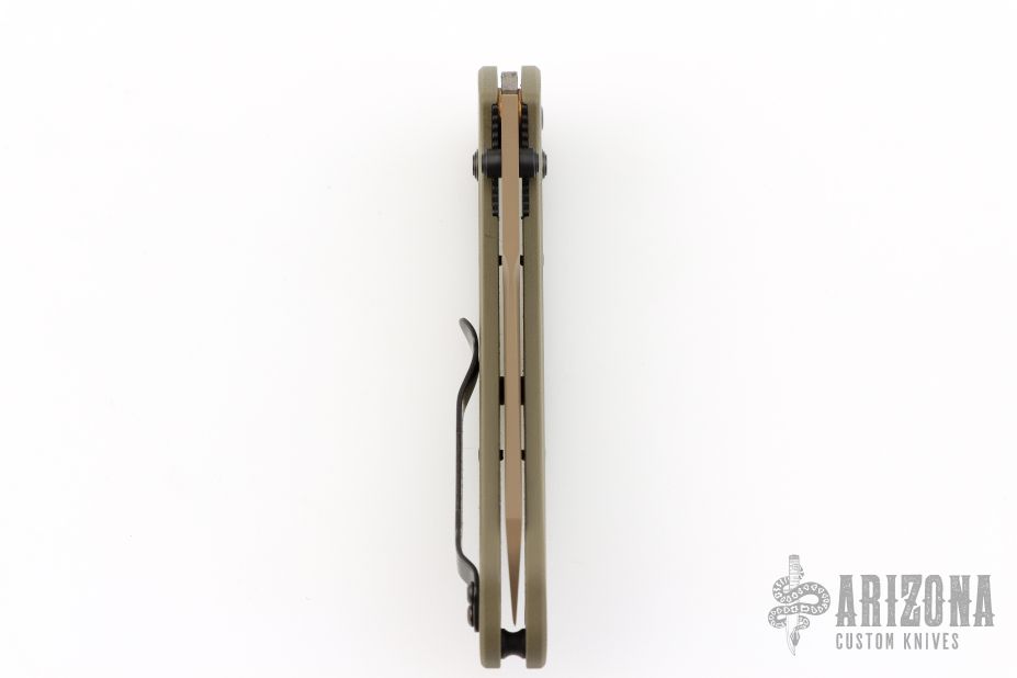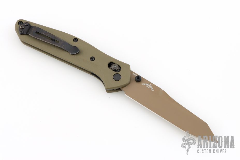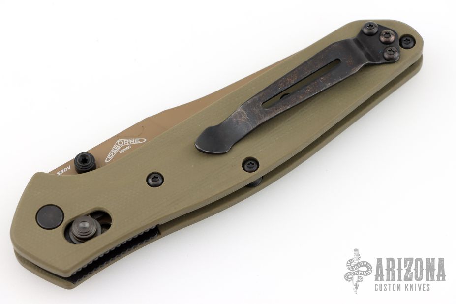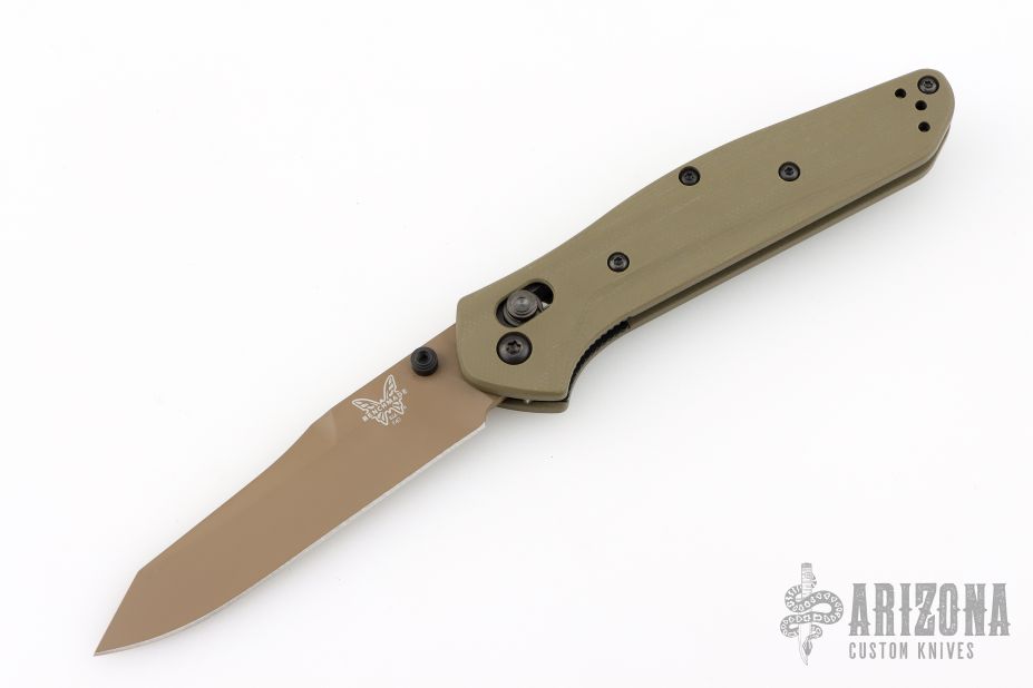 This 940BK Osborne Axis Lock Folder from Benchmade has a flat dark earth coated clip point blade with false top edge and dual thumbstuds. Handle is green G10 with a black finished stainless steel tip up clip (RH/LH Reversible). Nice blade seating and lockup. Comes with original box, papers and drawstring pouch. Excellent condition.
