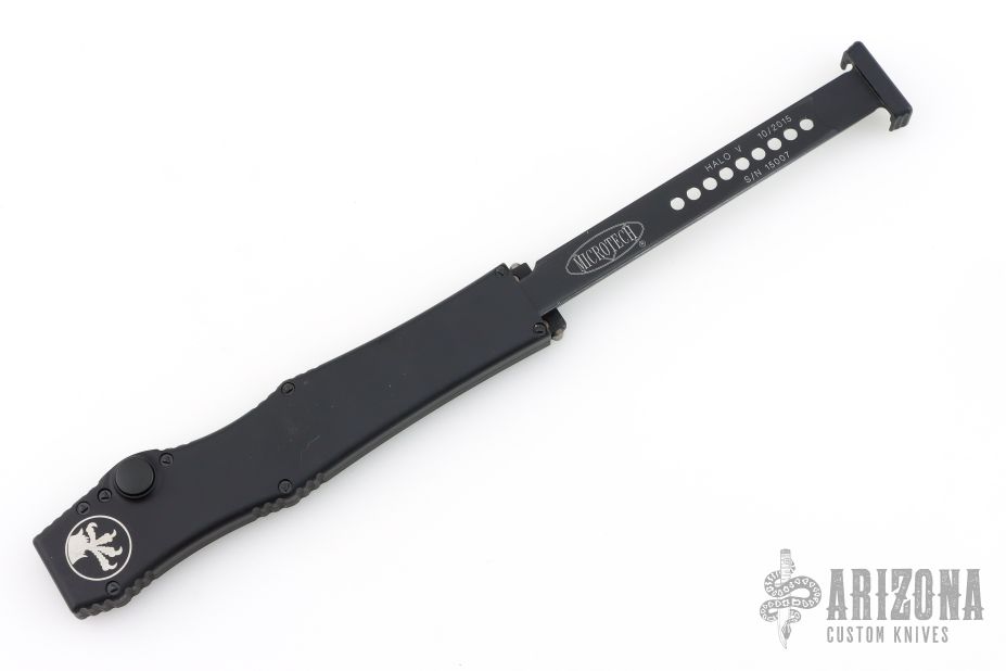 This Halo V OTF automatic has a two-tone black tanto blade with a standard edge and a black aluminum frame with black hardware. Dated 10/2015 and S/N 15007. Comes with original box, papers and sheath. Has a few light scuffs on the frame, otherwise excellent condition.