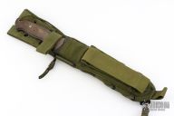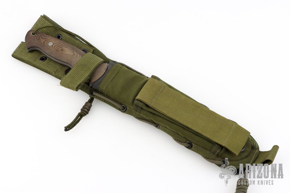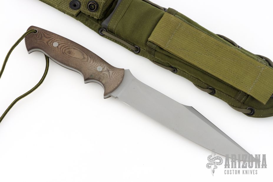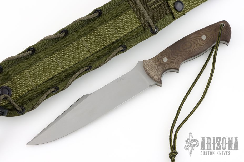 This McNulty Fighter by ABS Master Smith John Horrigan features a bead blasted blade with sharpened top edge, .204" blade stock and 1.489" blade depth, full tang construction. The handle has green linen micarta scales and a lanyard hole. Comes with a green nylon sheath. Has a few light scratches, otherwise excellent condition.
