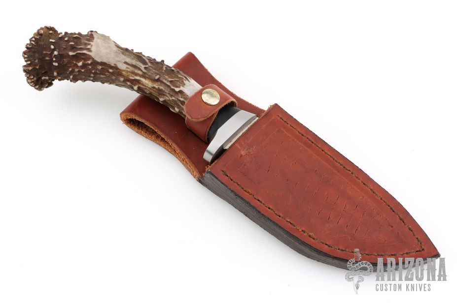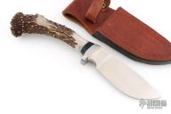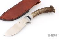 This knife by Jeff Mutz features a satin finished blade with .257" blade stock and 1.692" blade depth, hidden tang construction. The handle has a steel guard, black/silver spacers, and a crown stag grip. Comes with a brown leather sheath. Has some light scratches, otherwise Excellent condition.