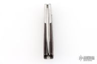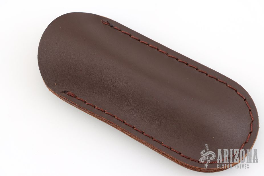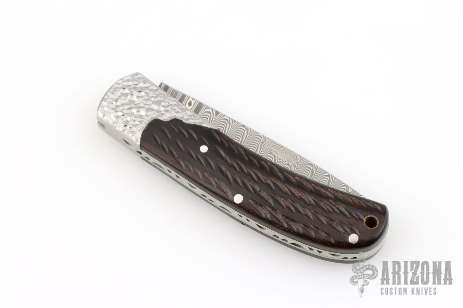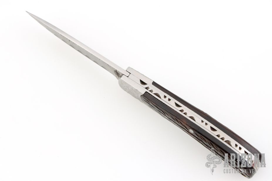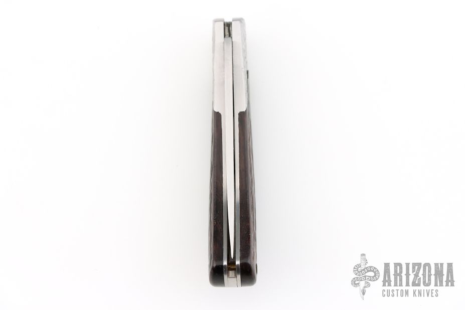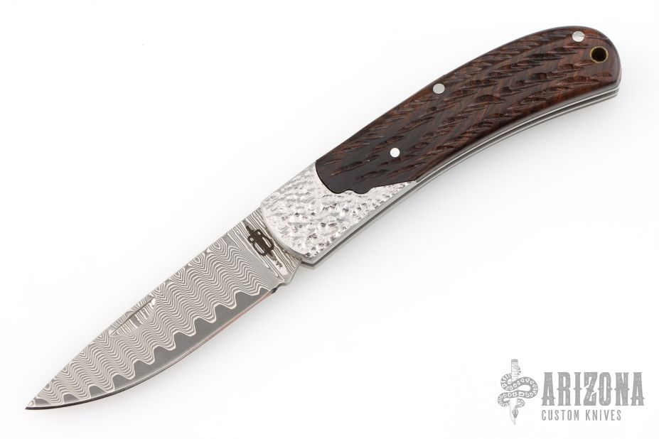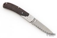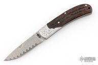 This Slipjoint from Buck and Bear Knives with a VG10 core San Mai Damascus blade with nail nick. The handle has textured stainless steel bolsters with integral liners, jigged wood covers, fileworked stainless steel backspacer. Good lockup and seating. Includes a zippered case. Excellent condition. Comes with a leather slip sheath.