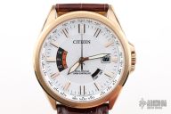 Rosegold-tone stainless steel case with a brown leather strap. Fixed rose gold-tone stainless steel bezel. White dial with rose gold-tone hands and index hour markers. Dial Type: Analog. Luminescent hands. Date display at the 3 o'clock position. Date, signal reception indicator, summer time indicator subdials. Citizen Caliber Eco-Drive H145 eco-drive movement. Scratch resistant sapphire crystal. Solid case back. Round case shape, case size: 43 mm, case thickness: 9.9 mm. Buckle clasp. Water resistant at 100 meters / 330 feet. Functions: perpetual calendar, atomic timekeeping, radio controlled, world time, date, GMT, second time zone, hour, minute, second, solar-powered. Watch label: Japan Movt. Citizen Perpetual World Time White Dial Men's Watch CB0253-19A.