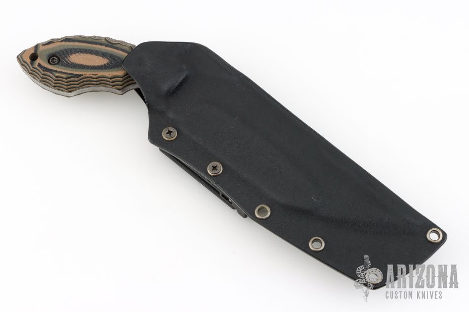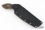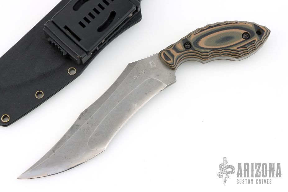 This Desperado by Kiku Matsuda features an acid etched blade with a false top edge and notched thumbrest, .193" blade stock and 1.775" blade depth, full tang construction. The handle has green/black/tan G-10 scales. Comes with kydex sheath. Has some oxidation spots on the blade, otherwise good condition.
