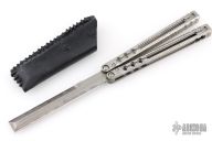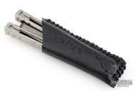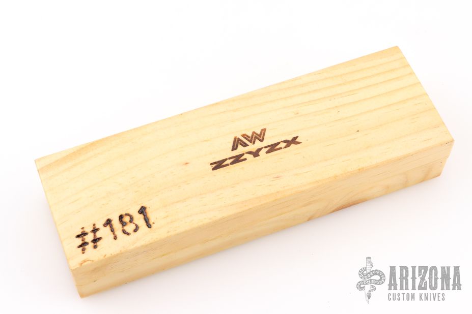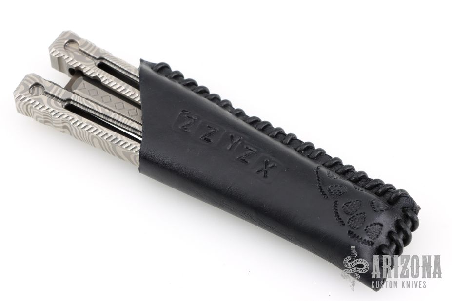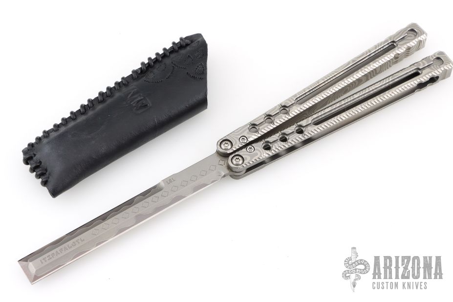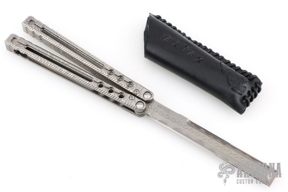 This ZZYZX Balisong by AcidWrx features a double edged blade with laser engraved hamon and diamond pattern on the flats. The handles are channel construction titanium with laser engraved Damascus pattern. Comes with original box, magnetic wooden box, COA dated 4-25 and #181, black leather slip sheath, lube and extra hardware. Excellent condition.