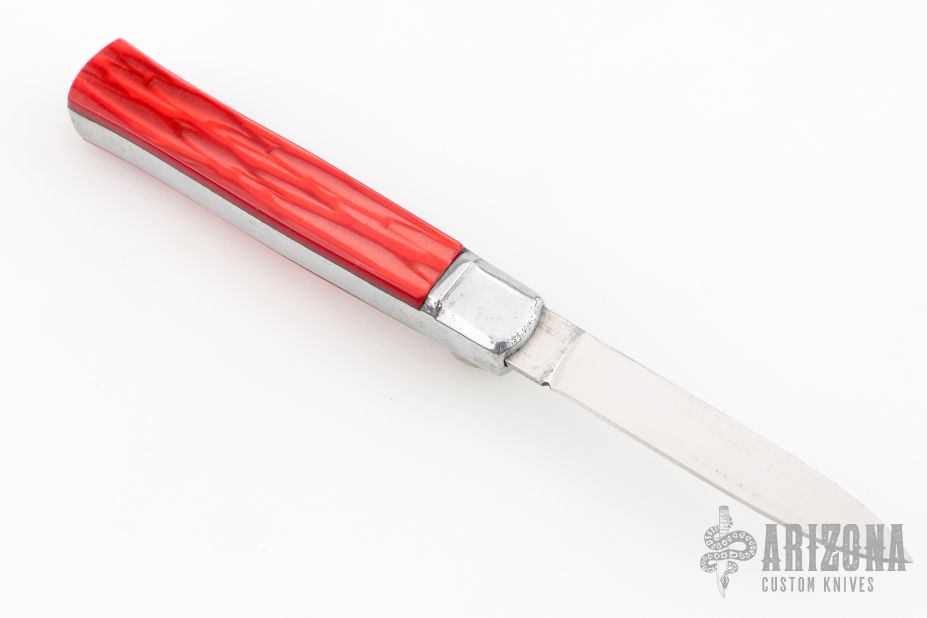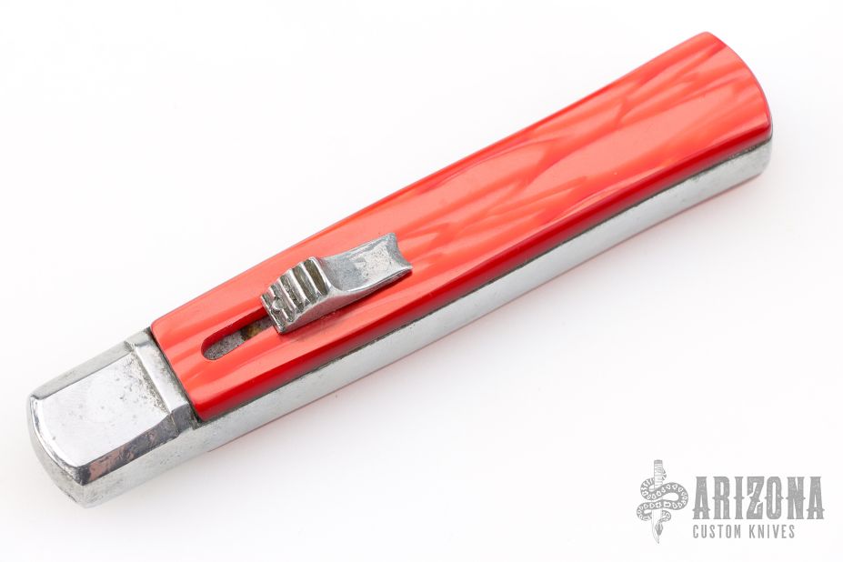 Vintage OTF Auto. Has some light scratches, otherwise excellent condition. Red handle and mirror finish drop point blade.