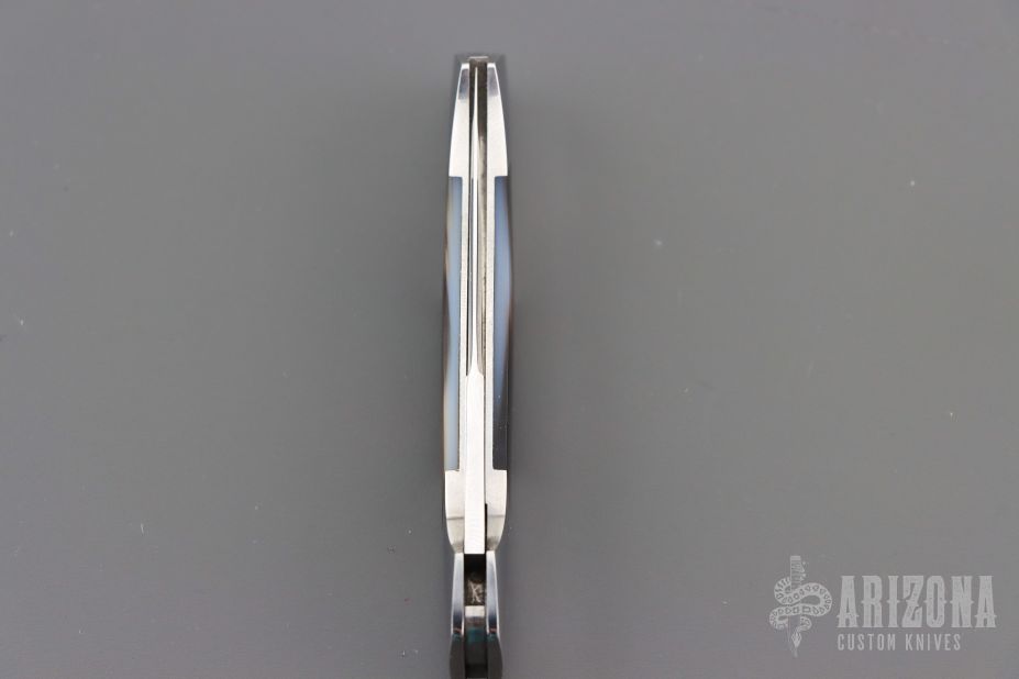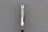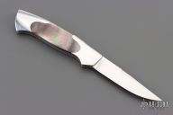 This is a sweet little gents knife by the legendary Tim Herman, it has a hand rub satin finished clip point blade with swedge and nail nick. The handle has polished steel bolsters, black lip pearl scales and stainless spring. Nice lockup and blade seating. Comes in a small stingray pocket slip. Has some light scratches, otherwise excellent condition.