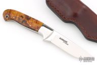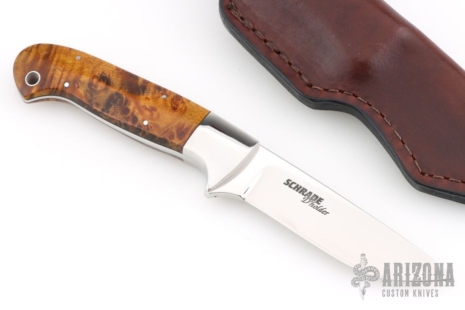 This collaboration between Schrade and D'alton Holder features a mirror polished blade with .160" blade stock and .926" blade depth, full tapered tang construction. The handle has mirror polished stainless steel bolsters, burl wood covers, black liners, and lanyard hole. Comes with original leather belt sheath. Has a couple light scratches, excellent condition.