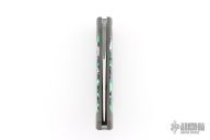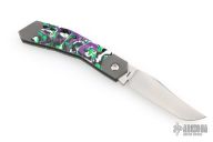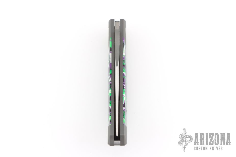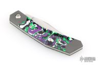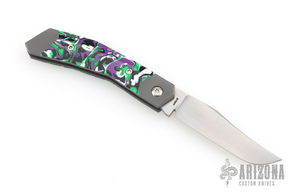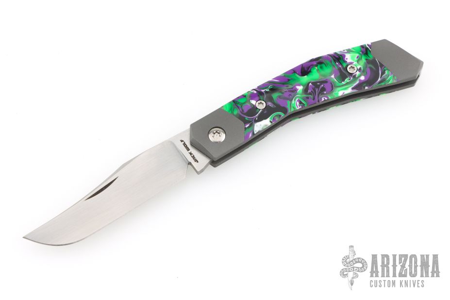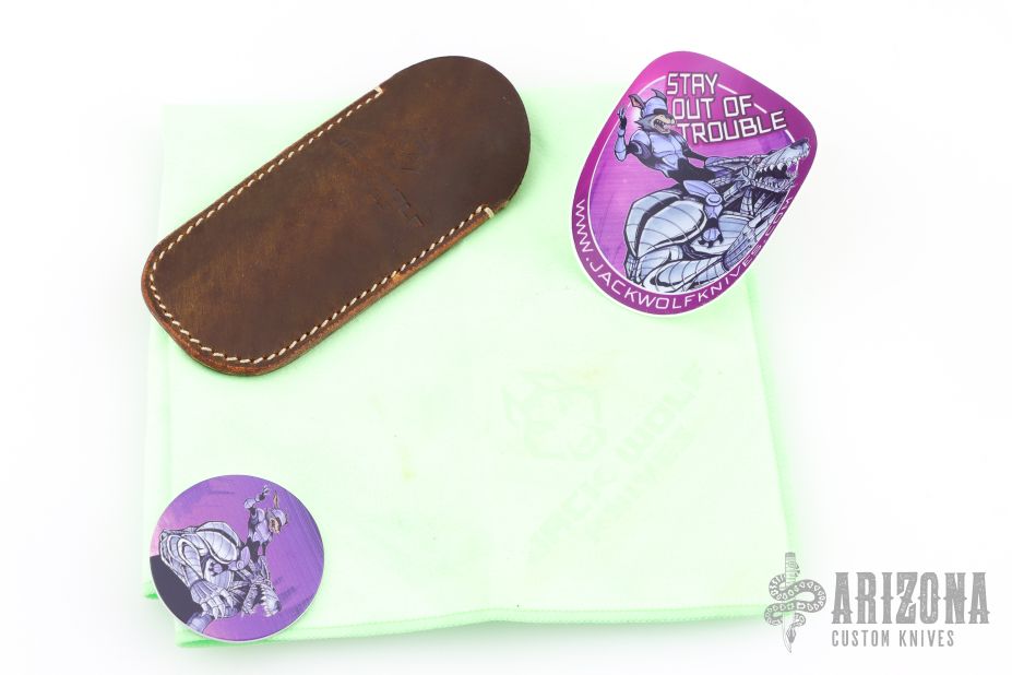 This Mini Cyborg Jack slipjoint model by Jack Wolf Knives features a hand satin finished clip point blade with nailnick. The handle has integral bead blast finish pinched and fluted titanium front and rear bolsters and liners, resin scales with a stainless spring. Comes with box, metallic tube with Sean Tiffany artwork, leather slip, sticker and microfiber cloth. Has a couple light scuffs, excellent condition otherwise.