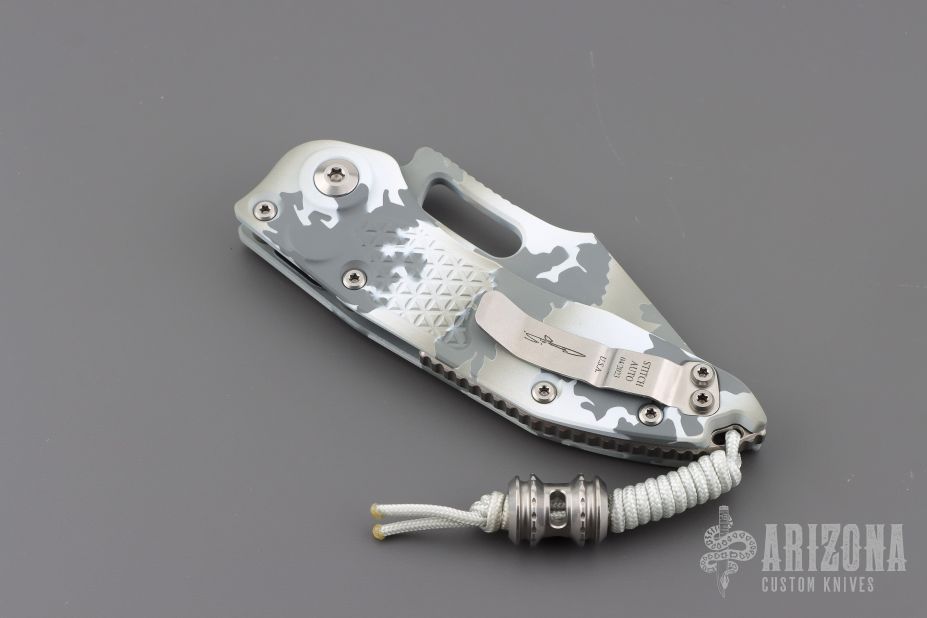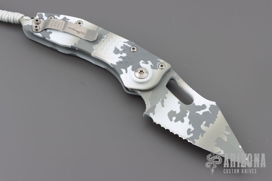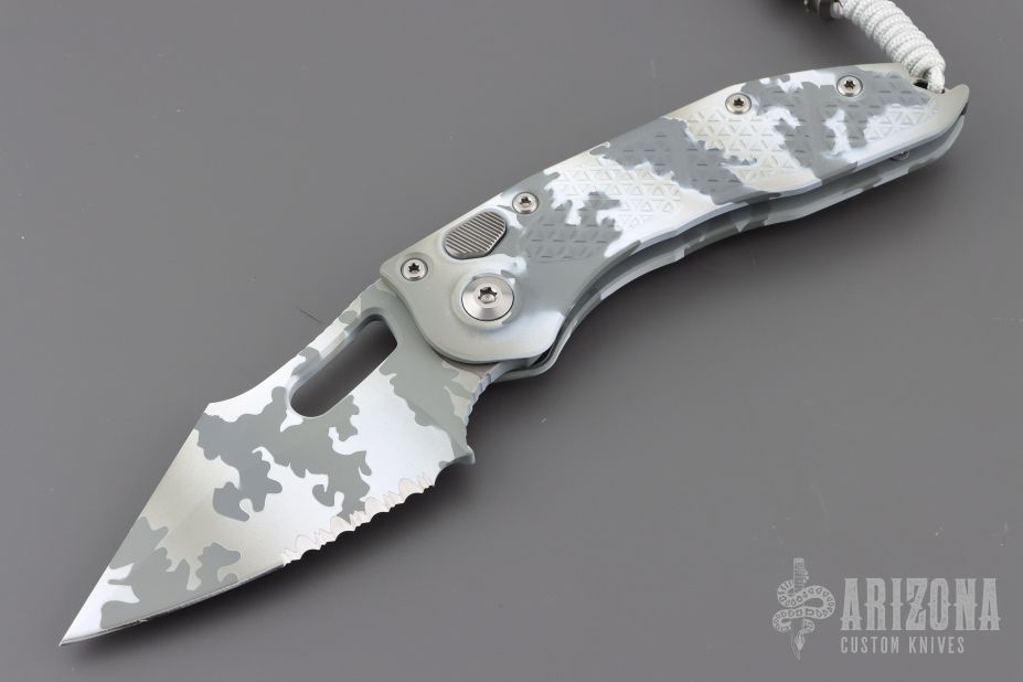This Signature Series Stitch Auto by Microtech Knives features an arctic camo finished partially serrated blade and false top edge, notched thumb and finger rests. The handle has an arctic camo milled aluminum handle with a titanium backspacer and a stainless steel clip, tip up carry, lanyard hole at the butt. Dated 04/2023. Includes the original box and papers.  Excellent condition.
