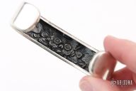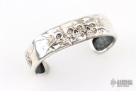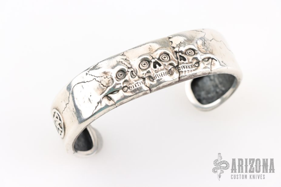 This 3 Skulls Bracelet by Vladimir Burkovski is made of .925 sterling silver. 3/4" wide, 1.25" opening, 2.125" tall. Excellent condition.
