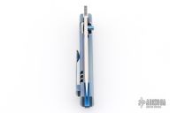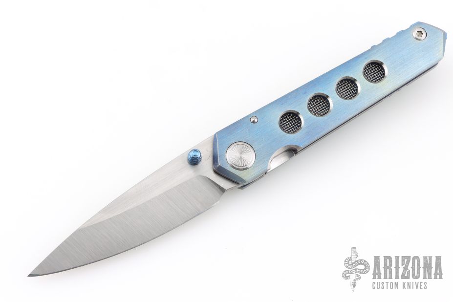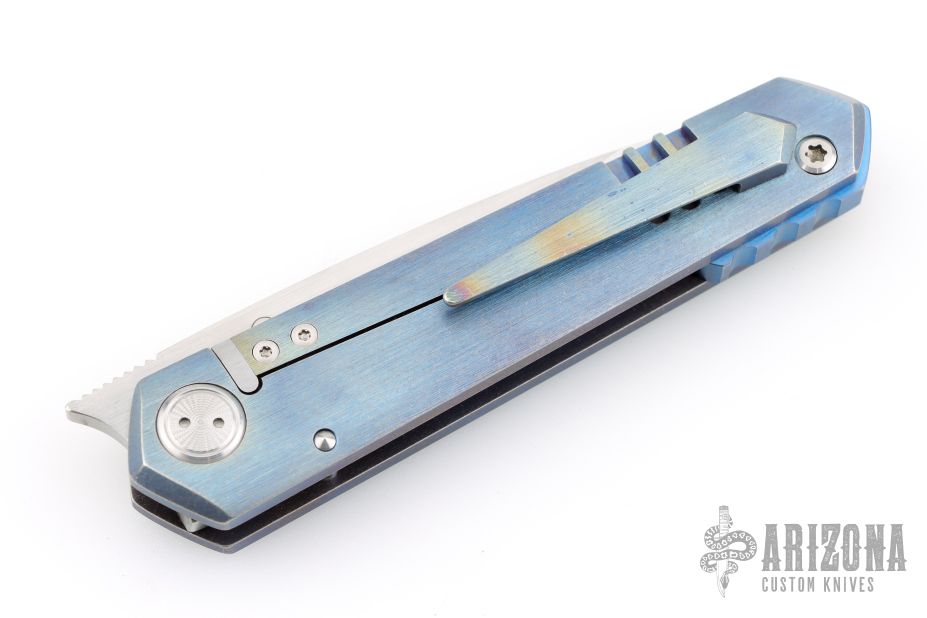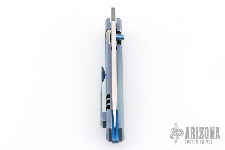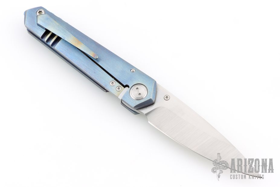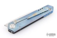 This icepick framelock front flipper from Sergey Rogovets features a satin finished blade with notched front flipper and a single anodized titanium thumbstud. The handle has a nicely contoured and anodized titanium frame with a matching tip up pocket clip with hidden screws, notched anodized titanium backspacer. The front scale has wire mesh behind the hole pattern, has a very cool look. Nice detent, lockup and blade seating, rides on bearings. Custom milled pivot. Locks up with no play, has a D2 lockface insert. Has a couple light scratches, otherwise excellent condition. Includes padded hard case and certificate of authenticity dated September 2021 and #2158.