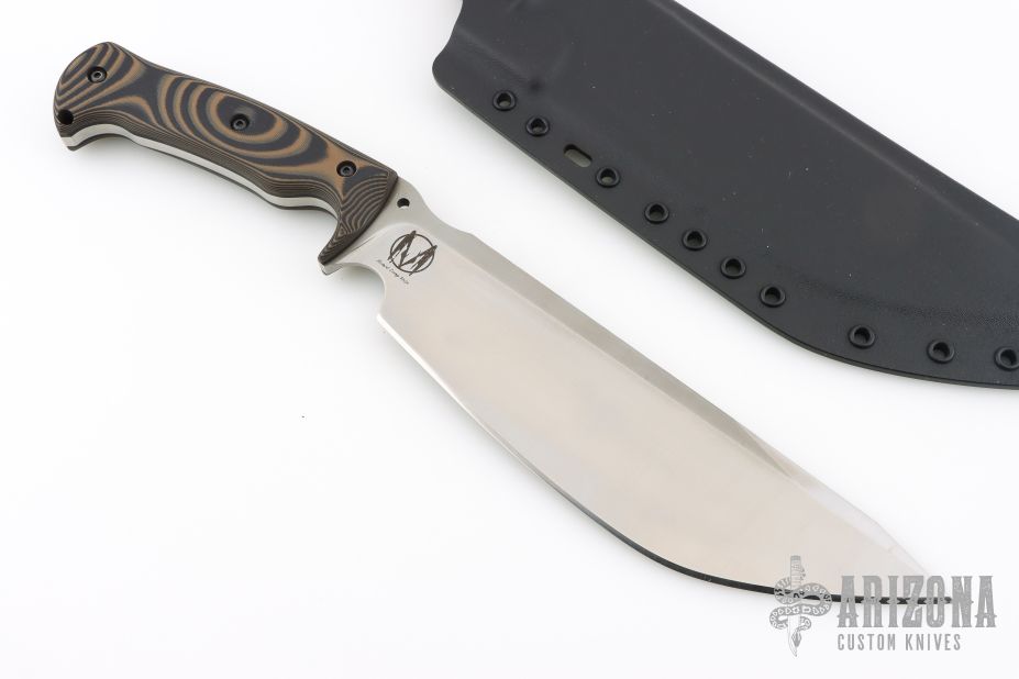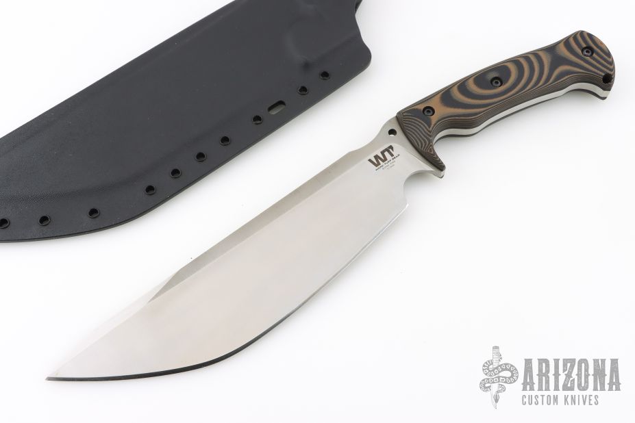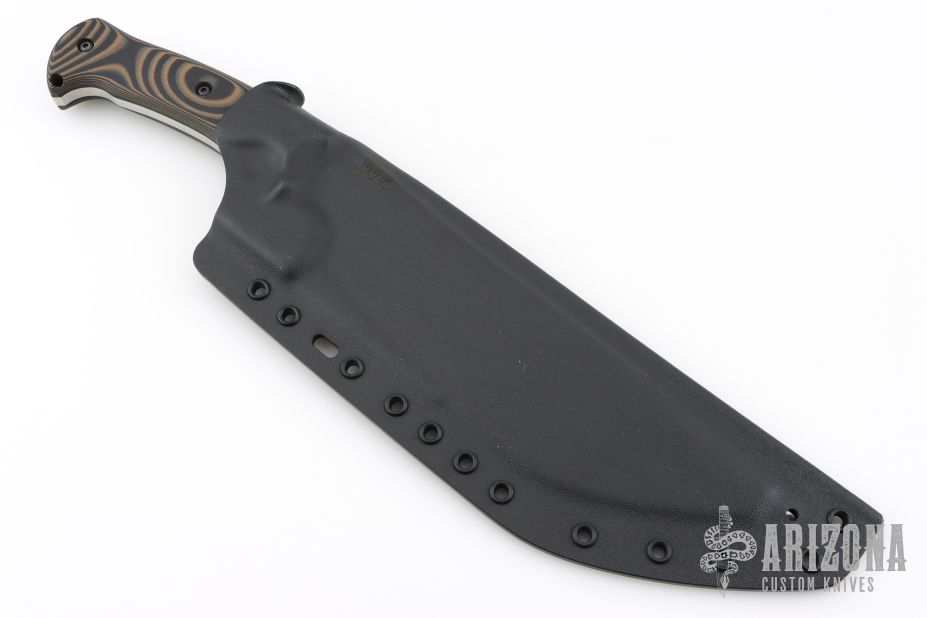 This Nomad Camp 9 by Work Tuff Gear features a satin finished Bohler K340 Steel blade with a saber grind that has a convex cutting edge, .256" blade stock and 2.447" blade depth, full tang construction. The handle has black/tan G-10 scales. Comes with a nicely fitted kydex sheath, box and extra belt loop hardware. Dated 11/2022.