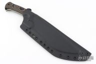 Nomad Design The Nomad was sketched out after a 2 week-long camping trip to the Sequoia National Forest back in 2012. The idea behind it is both wonderfully complicated and brilliantly simple at the same time. I wanted a knife that did what a Bowie is supposed to do historically. Chop like a hatchet, stab like a dagger and cut like a kitchen knife. So in many ways, the Nomad is just that, a big, wonderful “jack of all trades” knife that in my opinion does not suffer from some of the weaknesses associated with the traditional Bowie shape knife designs ie the more delicate tip, sometimes odd ergos and a guard to get in the way of finer jobs. So the tip was replaced with a traditional Tanto style, the guard becomes an integrated choil/guard for saving your hands in a hard stab and effectively reducing both the size of the usable blade and giving more control for finer detail work. Finally the handle, after years of working with Dark Timber Knives behind the scenes, all that ergonomic work we did on the Hooligan and Kodiak show up in this multiple position handle. Add to this package a forward cant with a long wide blade and you have a very capable large knife that looks like nothing else on the market.