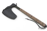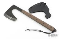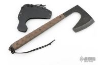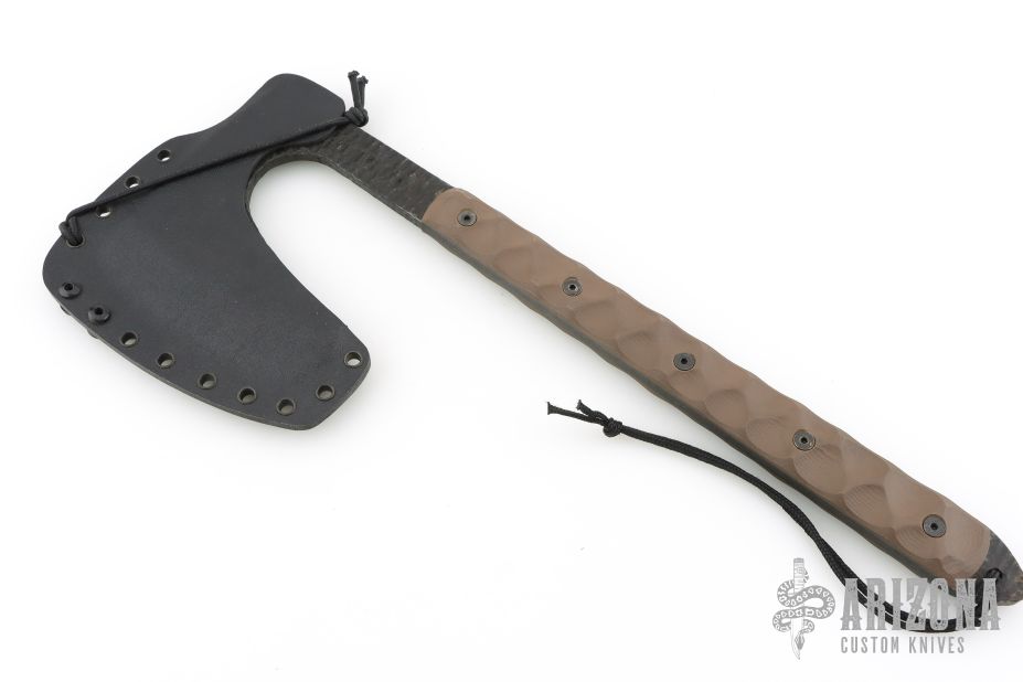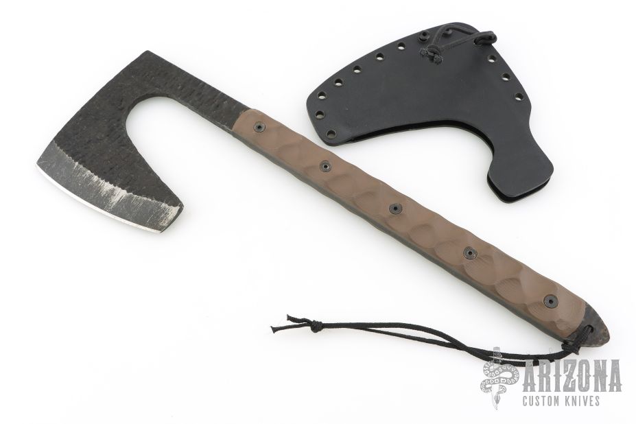 This Axe by Stroup Knives features a black blade with sculpted flats and a full tang construction, .264" blade stock and 4.5" blade length. The handle features sculpted brown G-10 scales.  Includes a kydex sheath. Has some minor wear on the blade finish, but that may have been intentional or always that way, otherwise excellent condition.