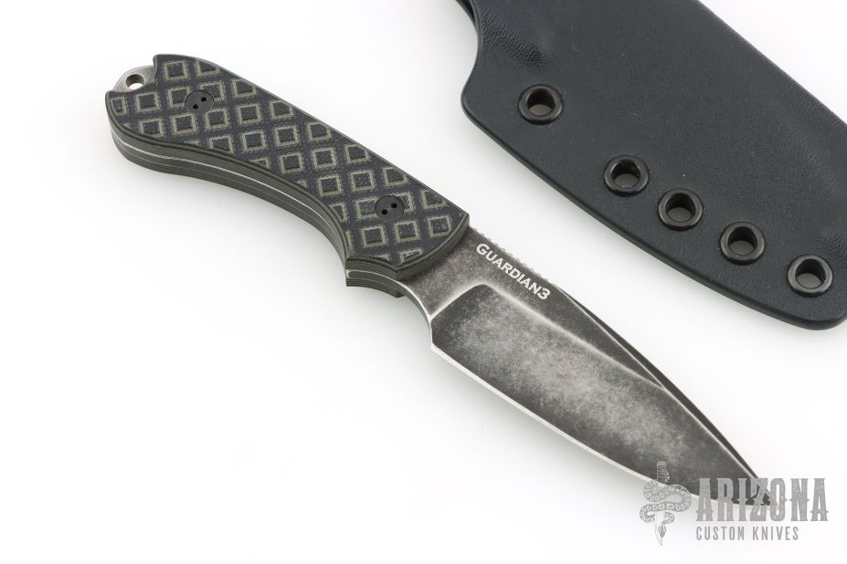 The Guardian3 is a relatively compact fixed blade that is designed to handle the work load that might typically fall upon a heavy duty everyday folder. Bradford Knives uses Bohler M390 steel with a double temper and cryo treatment for exceptional blade characteristics. Machined G-10 scales offer extreme grip without being abrasive. Each knife includes a premium leather sheath with belt loop and plastic blade insert.