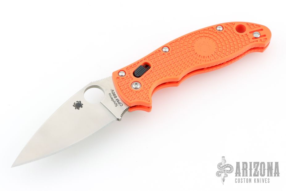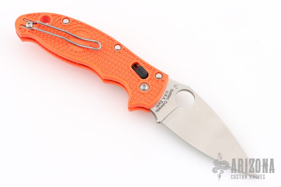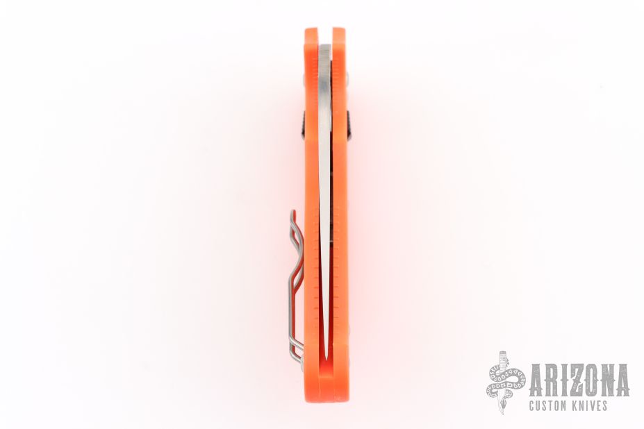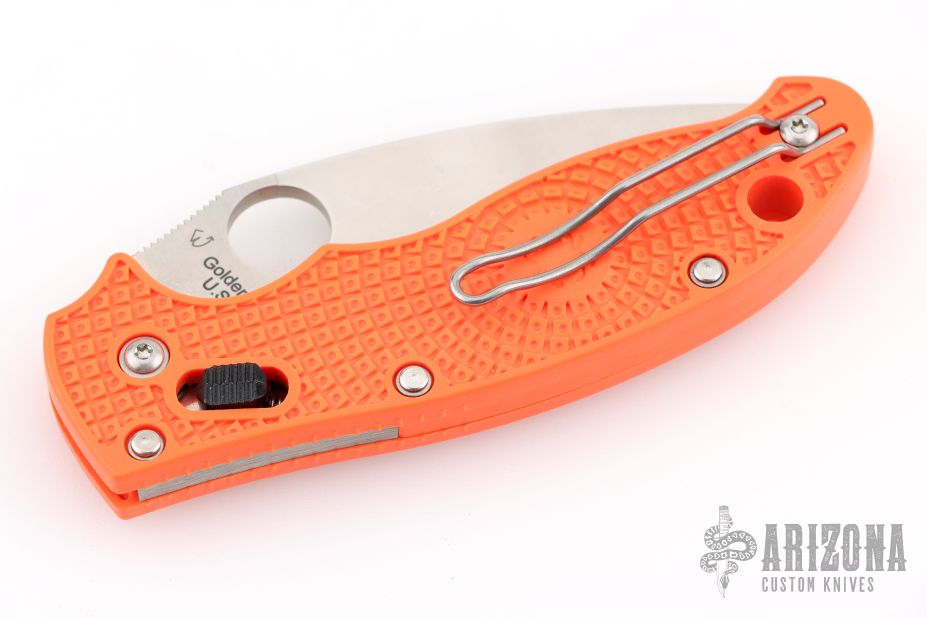 The high-visibility orange handle—a signature feature of Cutlery Shoppe Exclusives—is injection molded from ultra-lightweight fiberglass-reinforced co-polymer (FRCP) and features a high-traction Bi-Directional Texturing™ pattern for a secure grip in even the most demanding conditions. It is also home to Spyderco's patented Ball Bearing Lock™—a high-strength lock mechanism that offers an exceptionally smooth operating action. A reversible wire clip mounted to the butt end of the handle supports convenient left or right-side tip-up carry and completes the ambidextrous theme of the knife.
