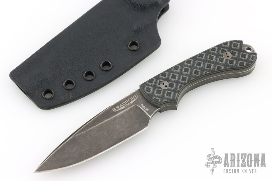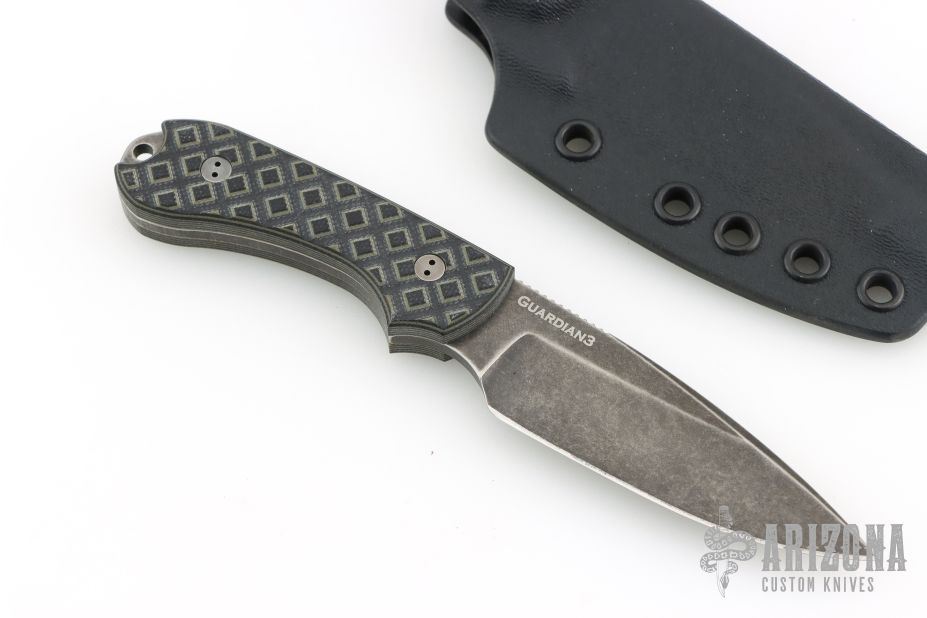 The Guardian3 is a relatively compact fixed blade that is designed to handle the work load that might typically fall upon a heavy duty everyday folder. Bradford Knives uses Bohler M390 steel with a double temper and cryo treatment for exceptional blade characteristics. Machined G-10 scales offer extreme grip without being abrasive. Each knife includes a premium leather sheath with belt loop and plastic blade insert.