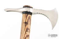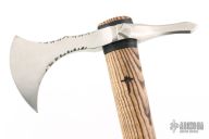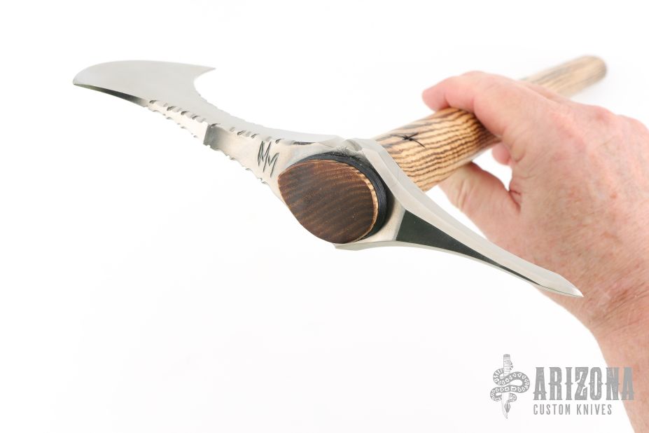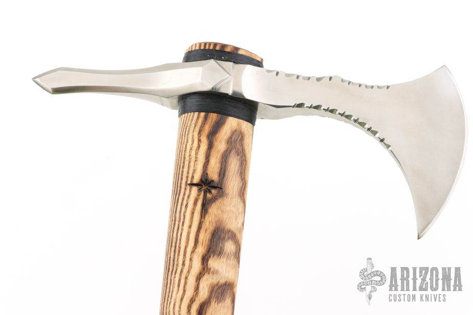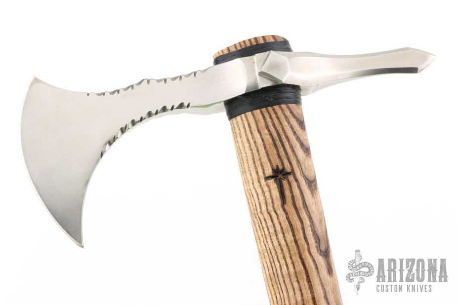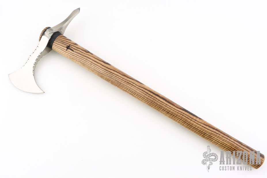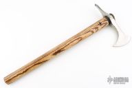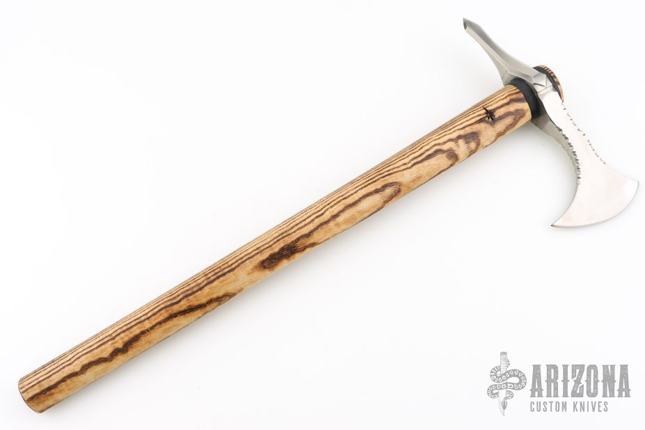 This Spike Hawk by Dylan Mccoon features a hand forged head with 3.5" cutting edge and a 2.75" spike, fileworked edges. Has a 19" wooden haft. Excellent condition. Comes with COA.