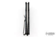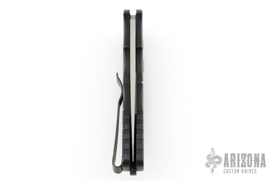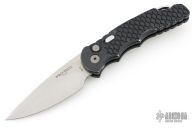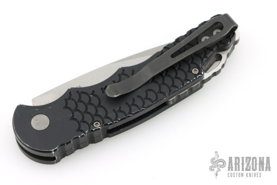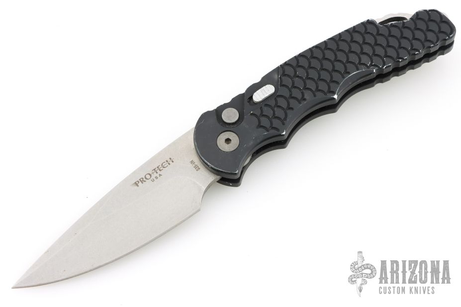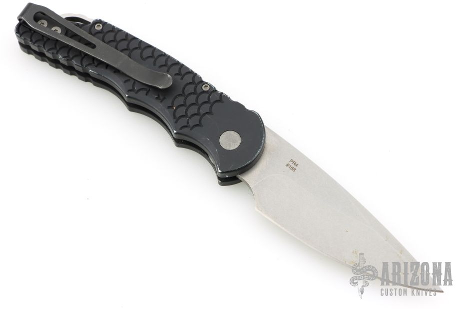 This TR-5 by Pro-Tech Knives features a stonewashed spear point blade. The handle has a black aluminum handle with fish scale milling patter, stainless steel backspacer with lanyard hole, tip up blade stainless steel clip.  Has scuffs, scratches and wear on the handle finish, otherwise good user condition. PR4 #168