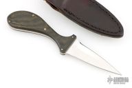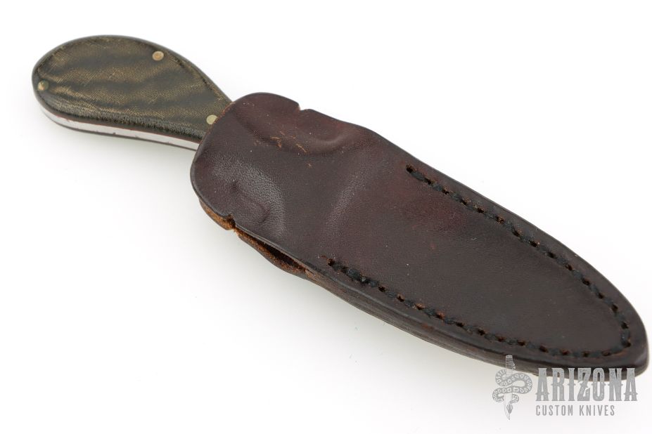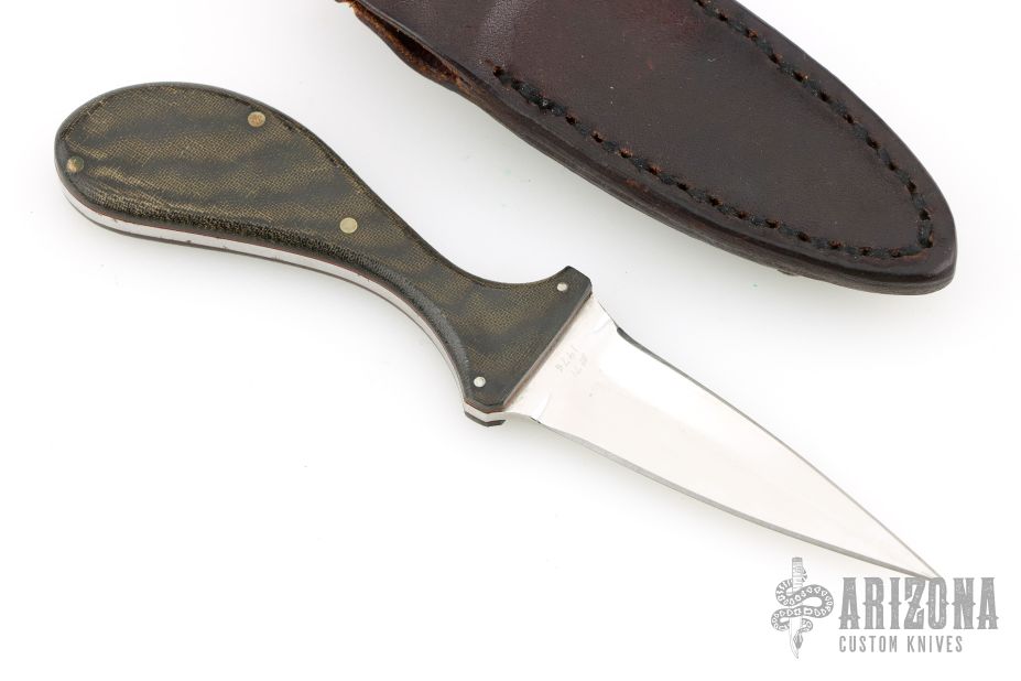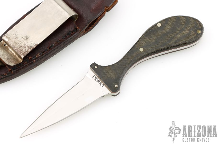 This is an older (dated 1978) boot knife (#71) by Pat Crawford features a double edged mirror polished blade, .109" blade stock and .785" blade depth, full tang construction. The handle has black linen micarta scales with nickel silver pins and red liners.  Leather sheath with boot clip. Has some light scratches, otherwise excellent condition.